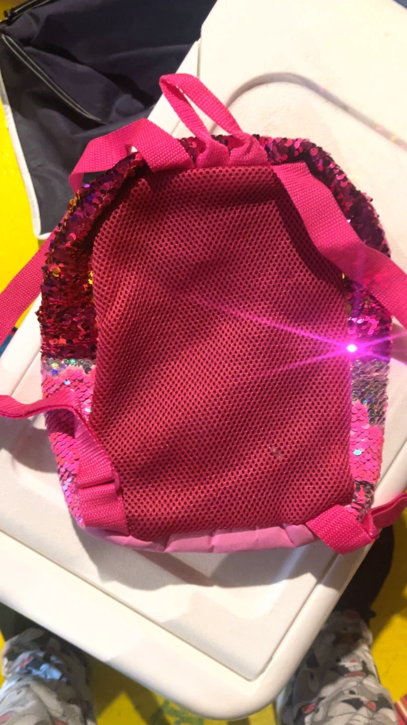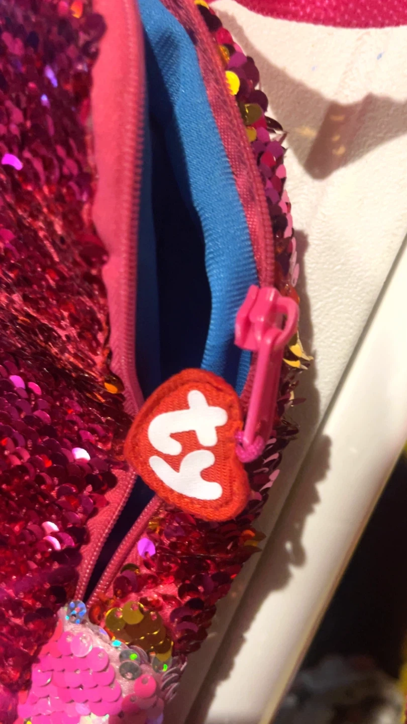 Adorable pink sequin backpack featuring a Ty Beanie Boo flamingo design. It has a zippered main compartment with a blue lining and adjustable straps. Perfect for little ones to carry their essentials!