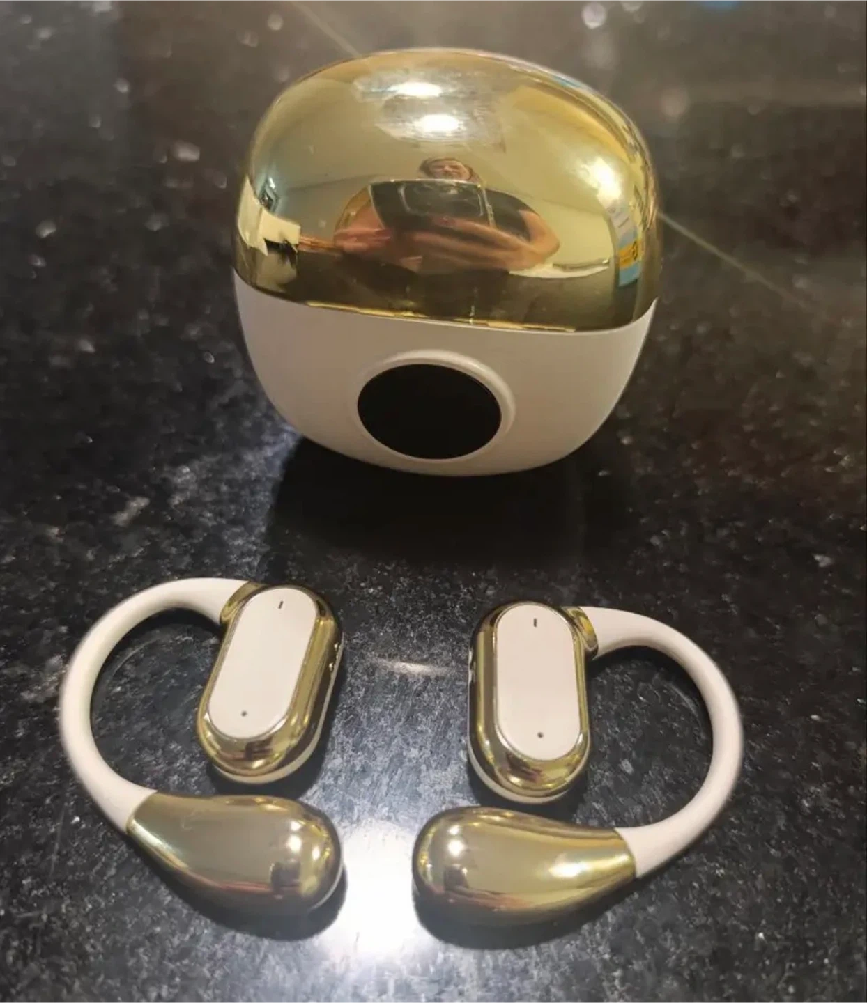 Brand new wireless earbuds with a stylish gold and white charging case. Includes charging cable and manual. These earbuds are great for listening to music on the go!