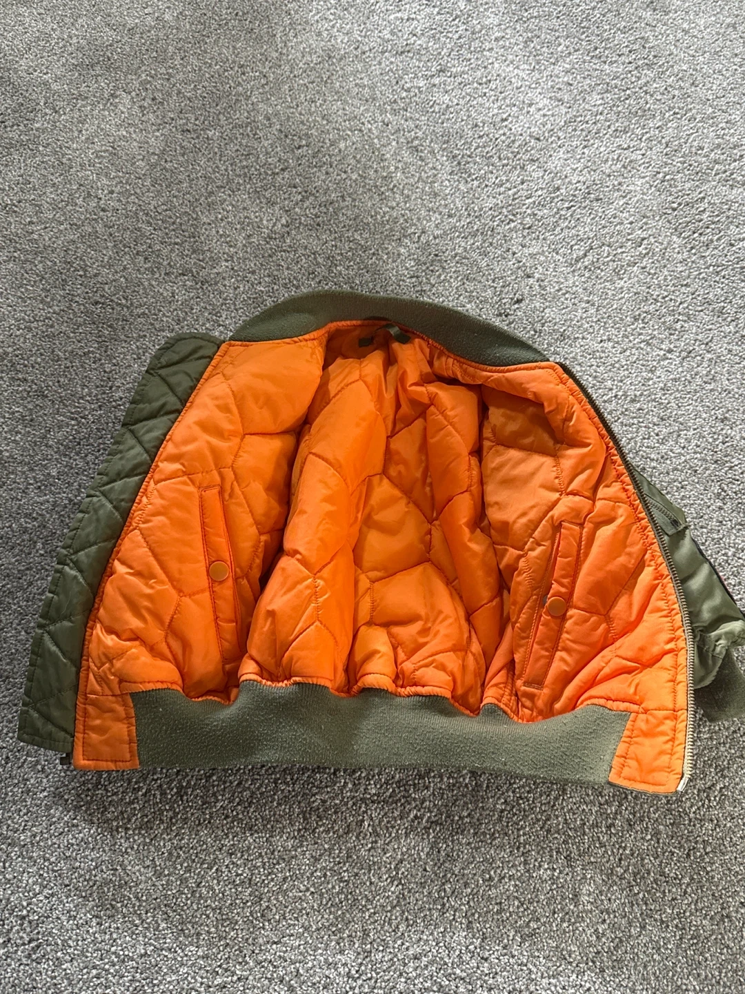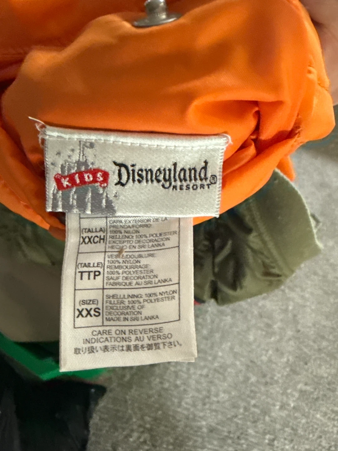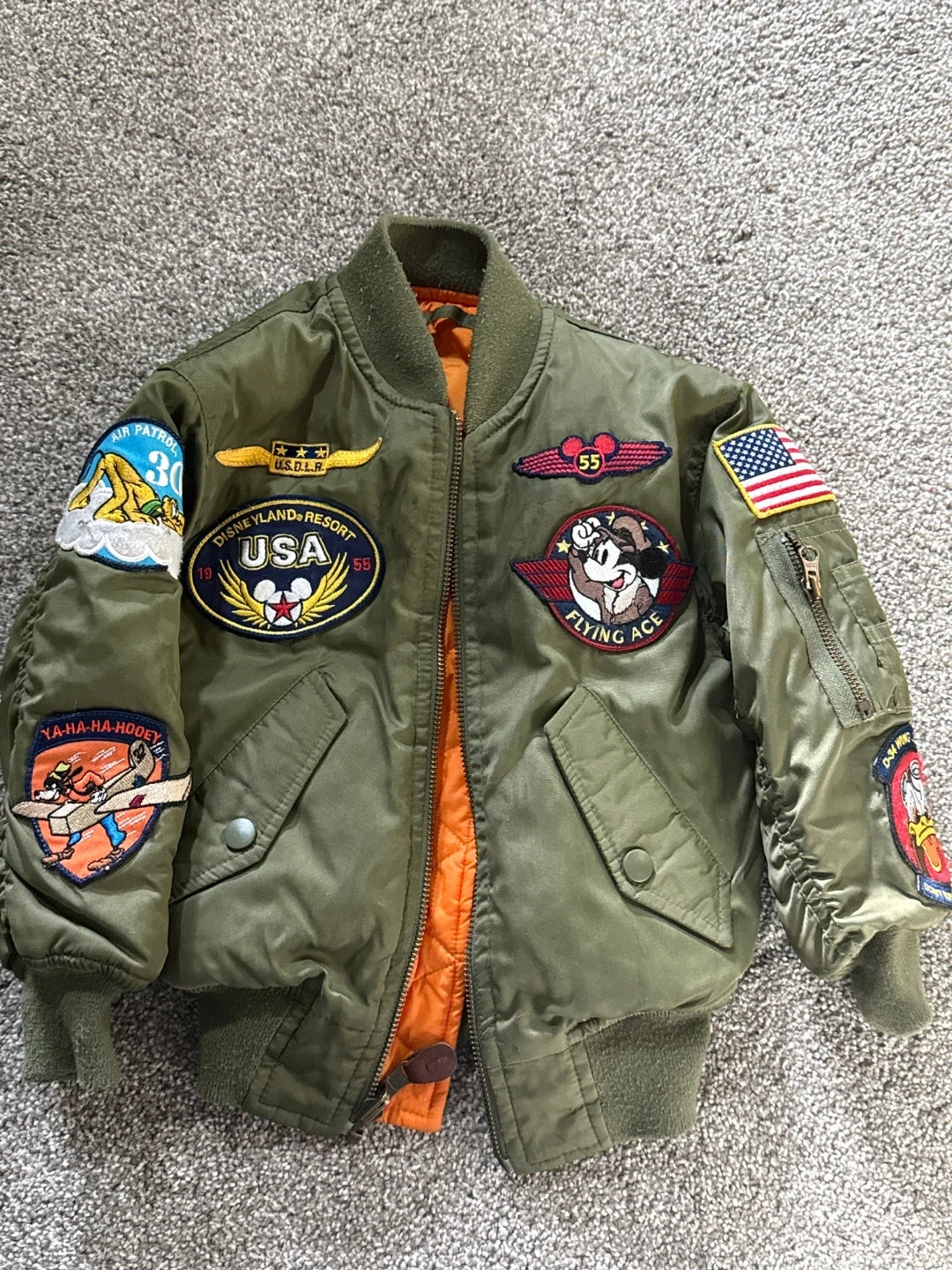 This youth bomber jacket features a vibrant orange quilted lining and multiple embroidered patches, including a US flag and Mickey Mouse flying ace design. Shelling and filler are 100% polyester. Kids' size XXS.