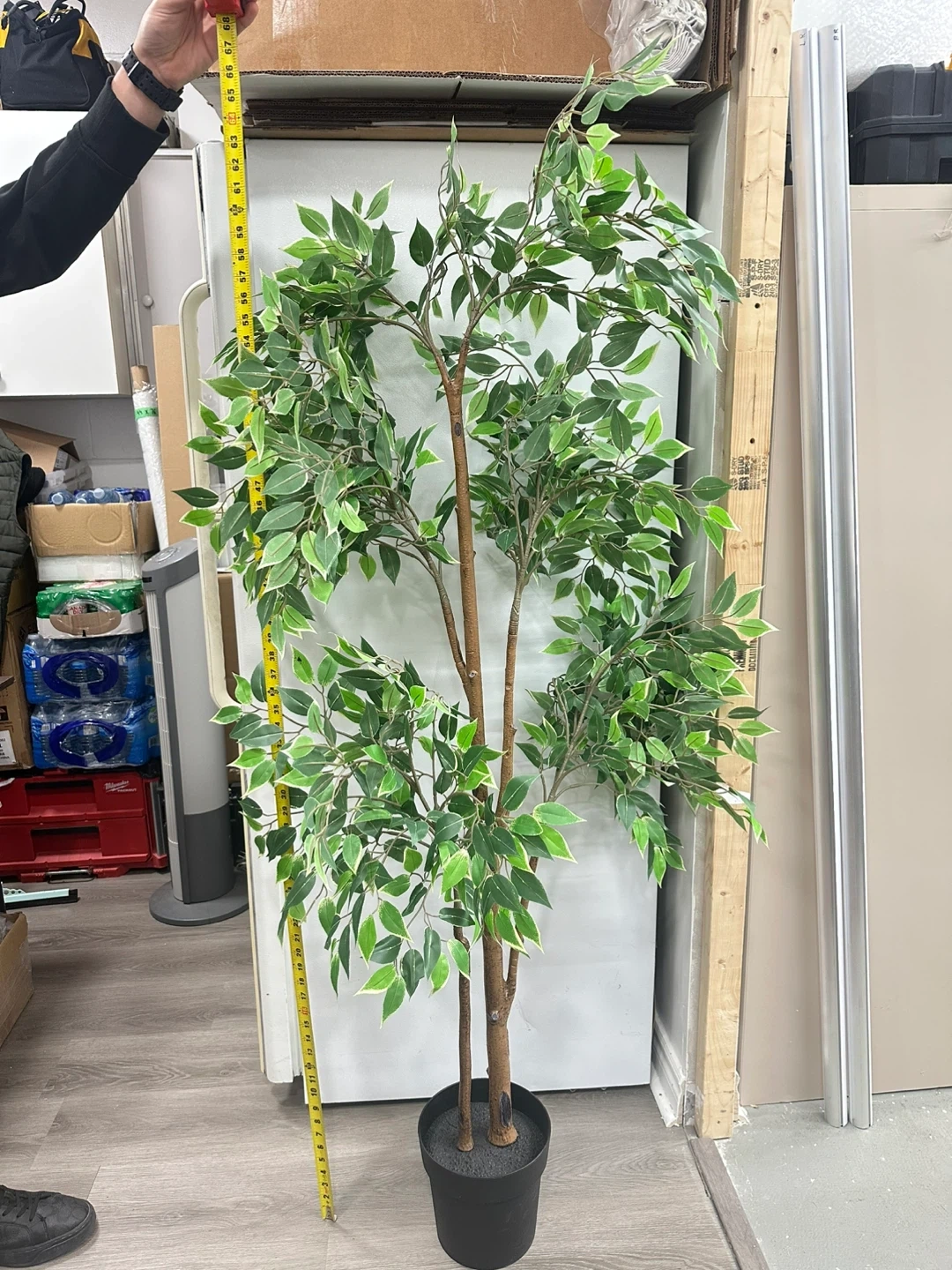 This is an artificial tree with green leaves. It stands approximately 5 feet tall and comes in a black pot. No assembly required!