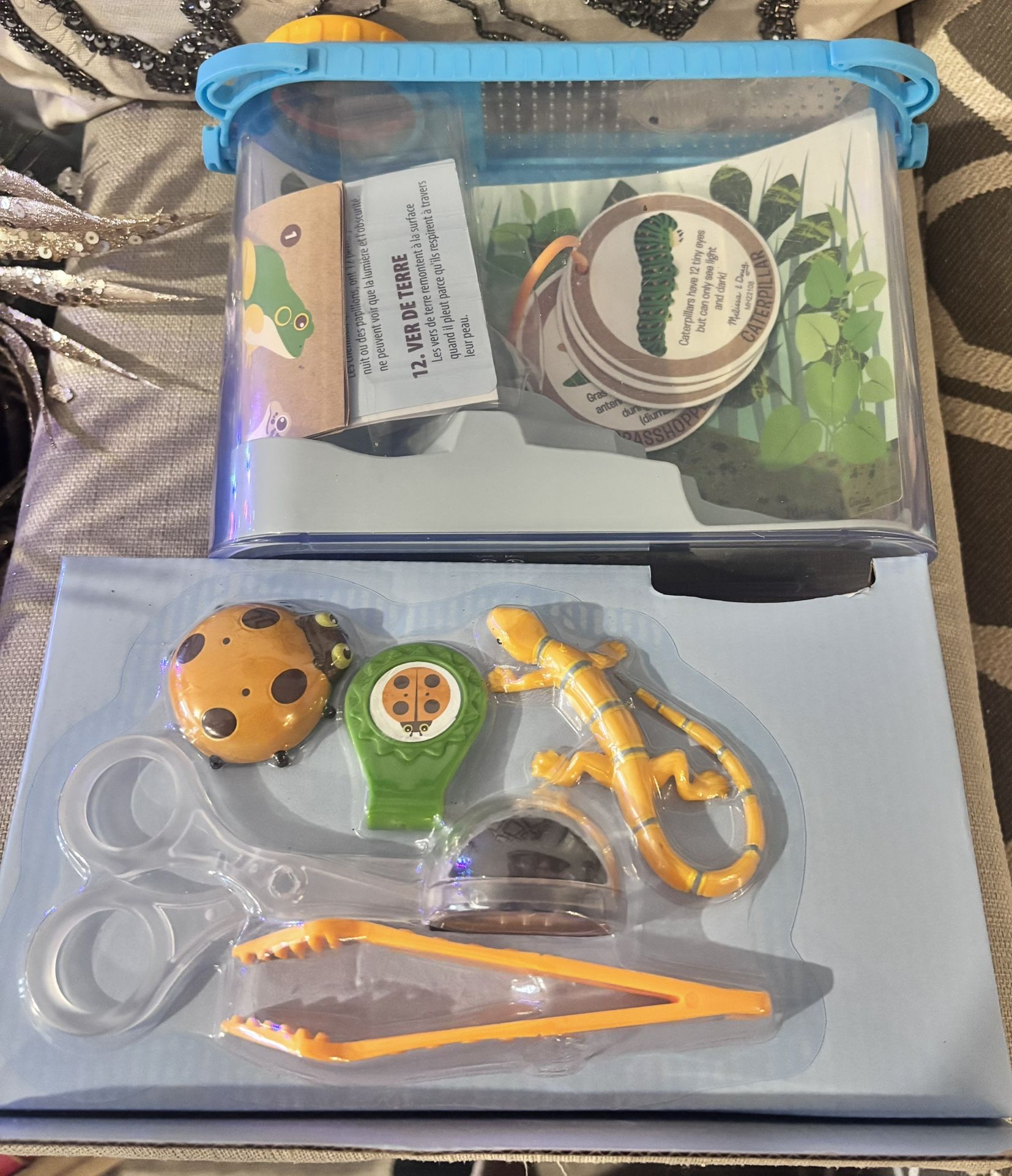 Melissa & Doug Let’s Explore Terrarium Observations Play Set – complete set. Everything is new, except the box. The box is damaged and frayed, but the contents inside are in their plastic and never used.