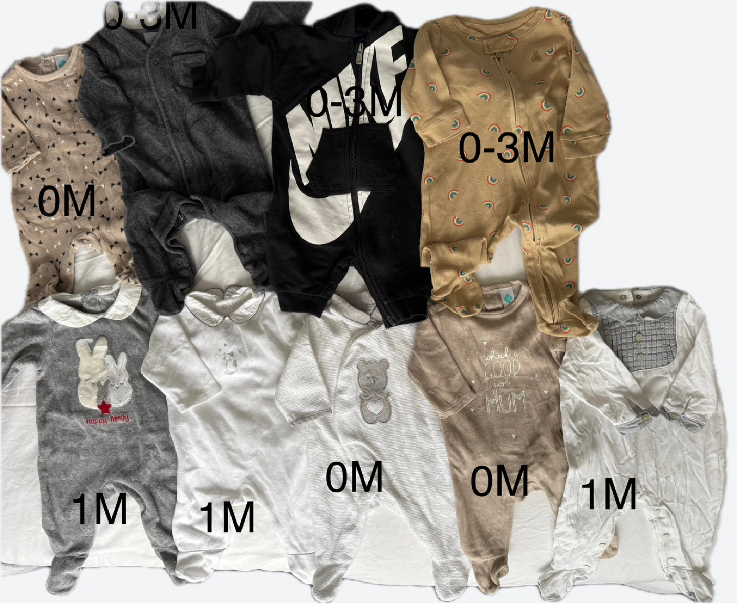A collection of gently used baby onesies and sleepers in various colours and styles. Includes brands like Nike and Baby Gap. Perfect for your little one!