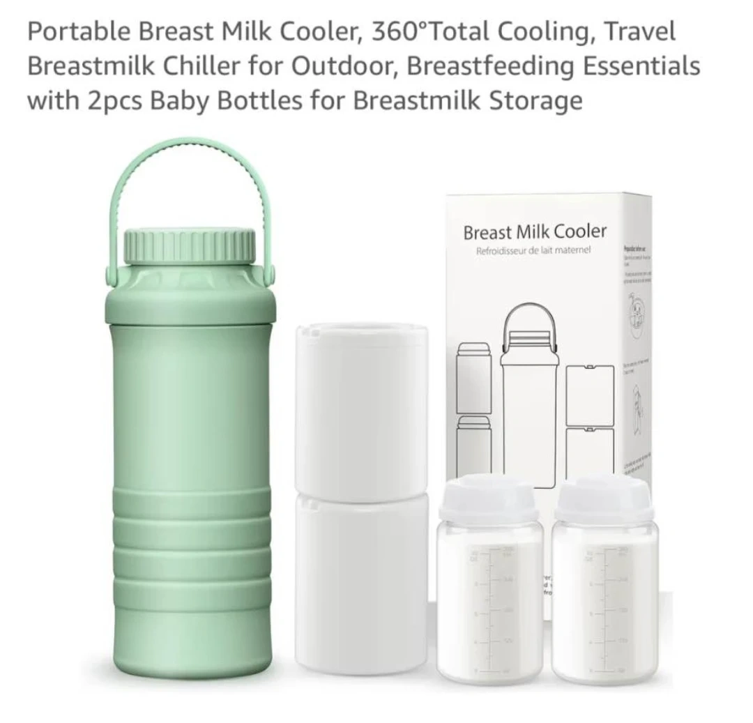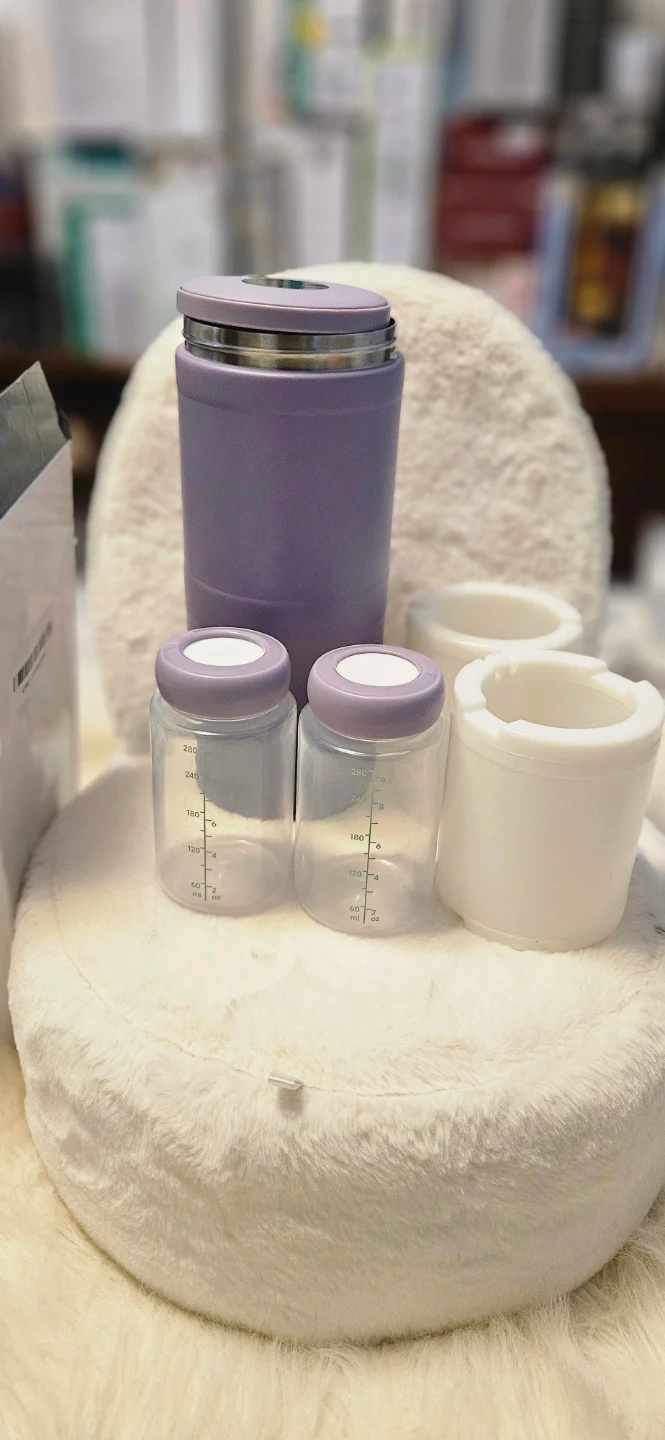 This portable breast milk cooler is great for travel and outdoor use. It offers 360° total cooling. Includes 2 baby bottles for breast milk storage. Cooler is a light purple colour and comes with white ice packs.