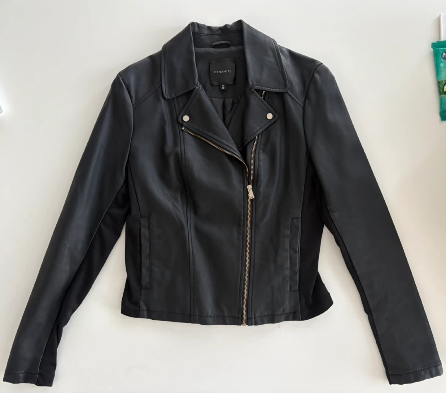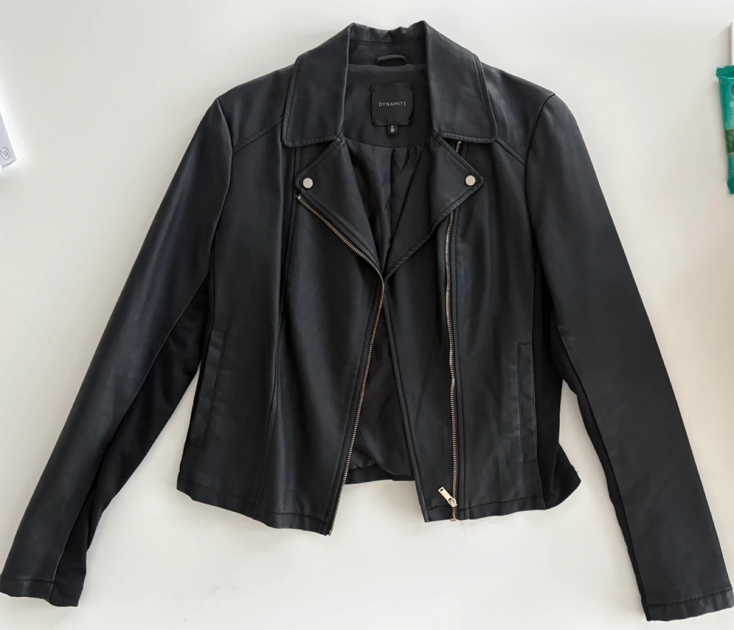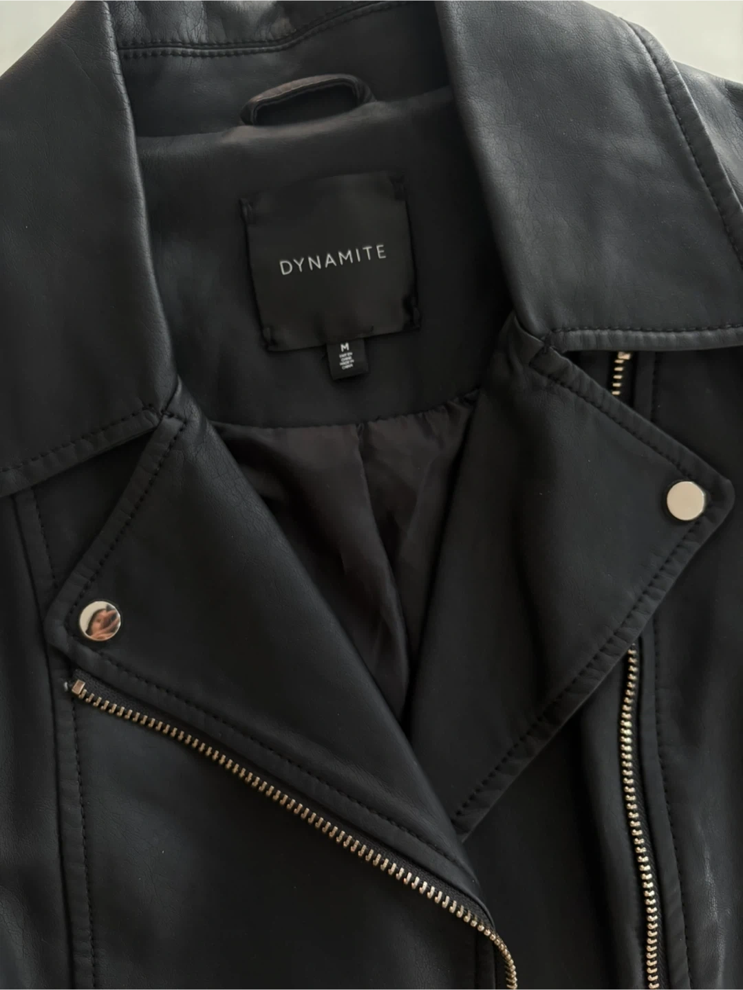 It's a size medium, fits like a small. The jacket features a zip-up front and a satin-like lining. Worn only twice. It’s in great condition. Great for Fall!
