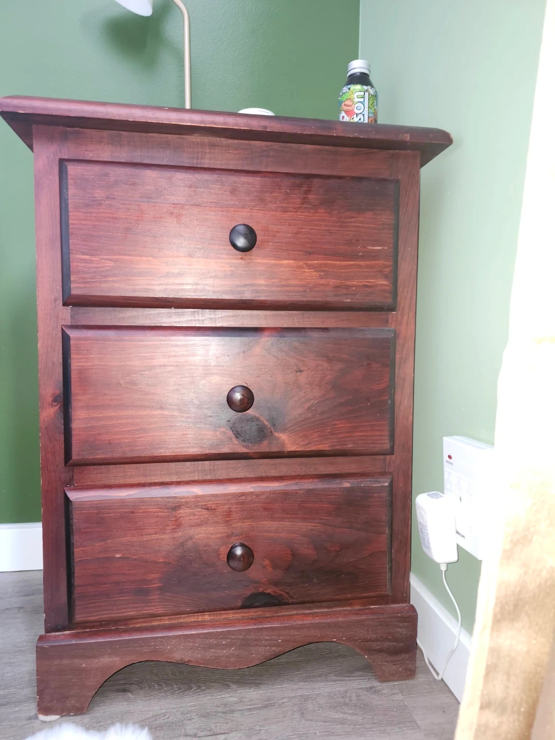 A solid wood dresser featuring three drawers with dark knobs. The wood has a rich, stained finish. It's a handy piece for bedroom storage. Great for keeping clothes tidy!