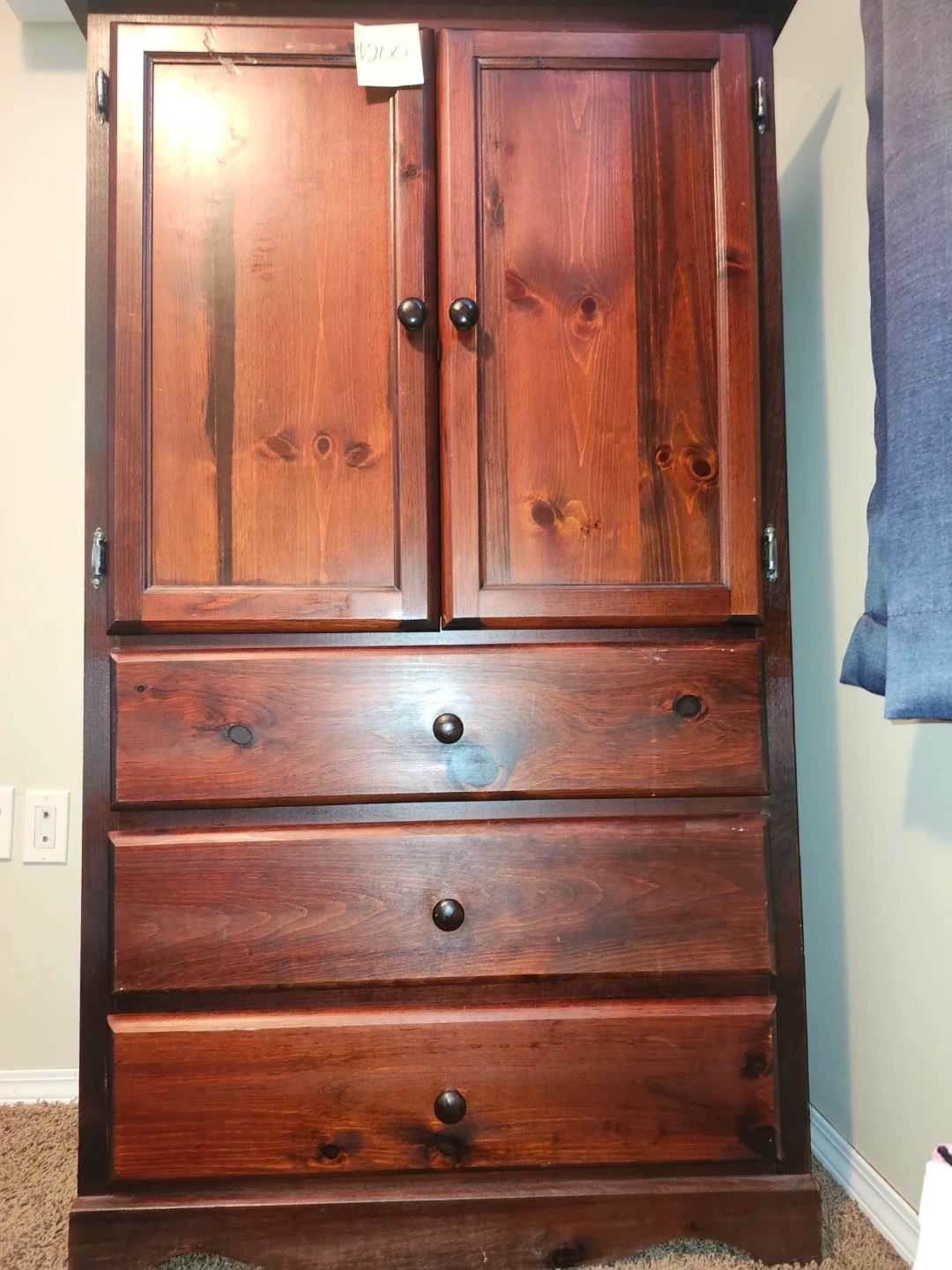 A solid wood dresser featuring three drawers with dark knobs. The wood has a rich, stained finish. It's a handy piece for bedroom storage. Great for keeping clothes tidy!
