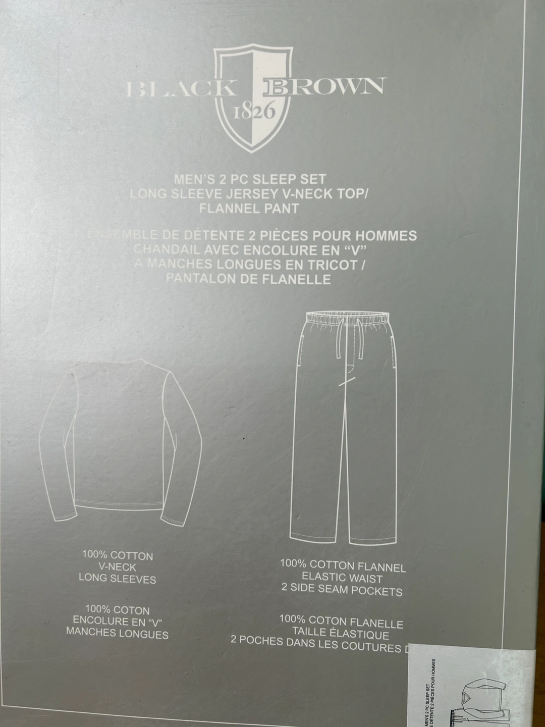 BNIB - Selling 2 pairs brand new Black Brown 1826 pajama sets in size M. It comes in the original box and includes a long-sleeved V-neck top and flannel pants with an elastic waist and side seam pockets. Top and bottom 100%cotton.