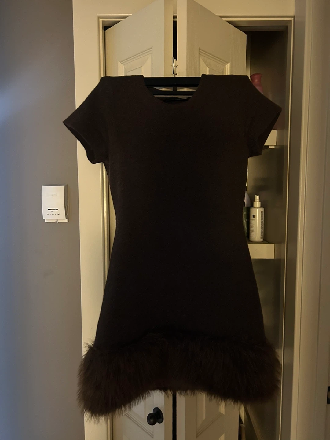 This dress features a unique faux fur trim at the bottom, adding a touch of elegance to the knit fabric. Perfect for a stylish and cozy look!