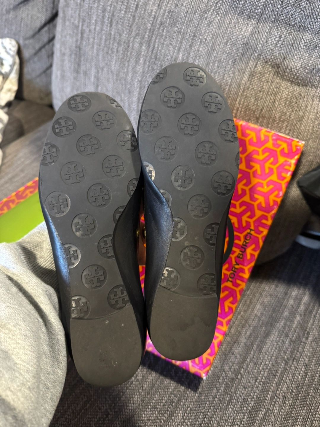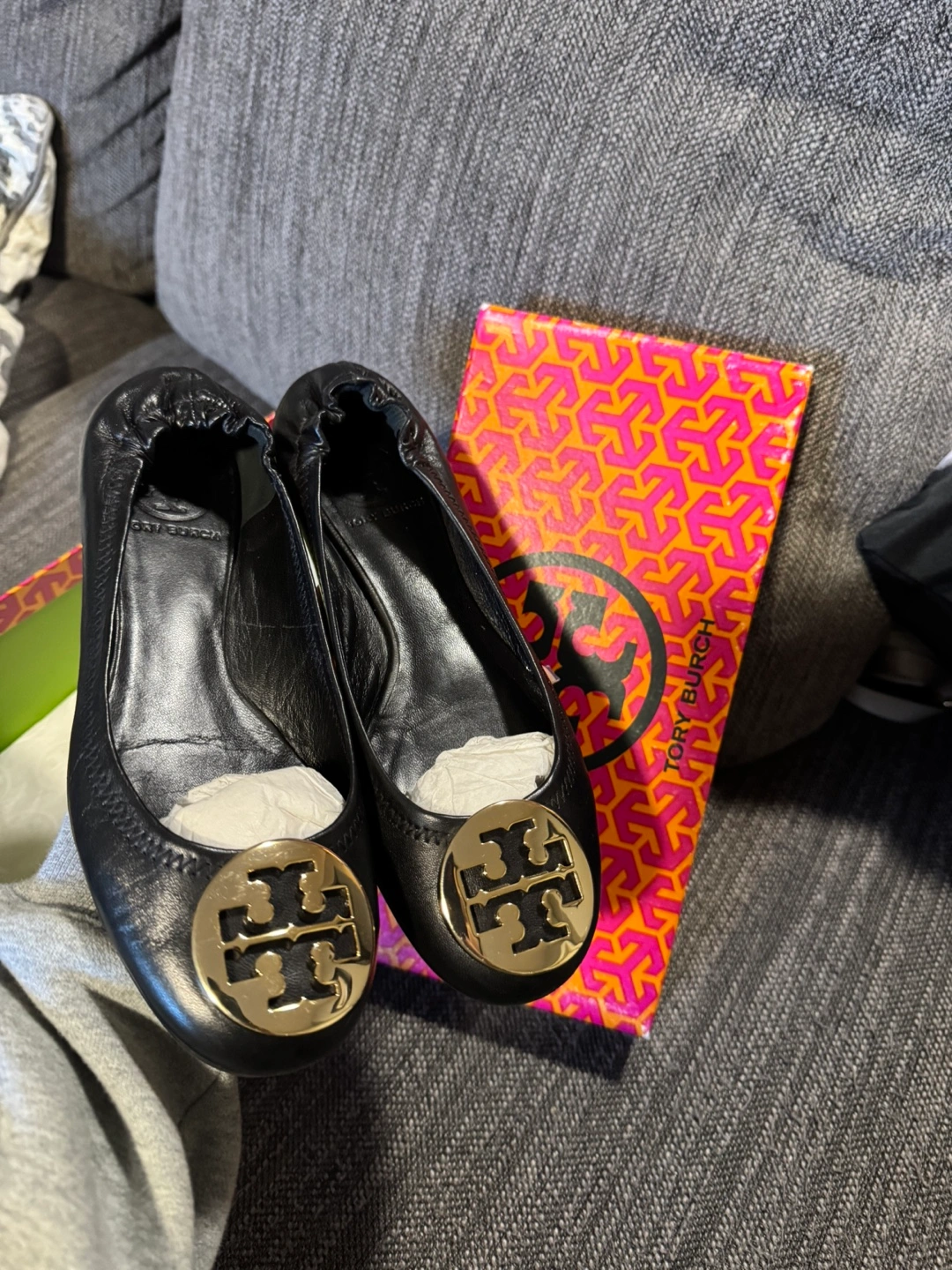 Women's black leather ballet flats. Gold logo detail. Minimal wear. Comes with original box.