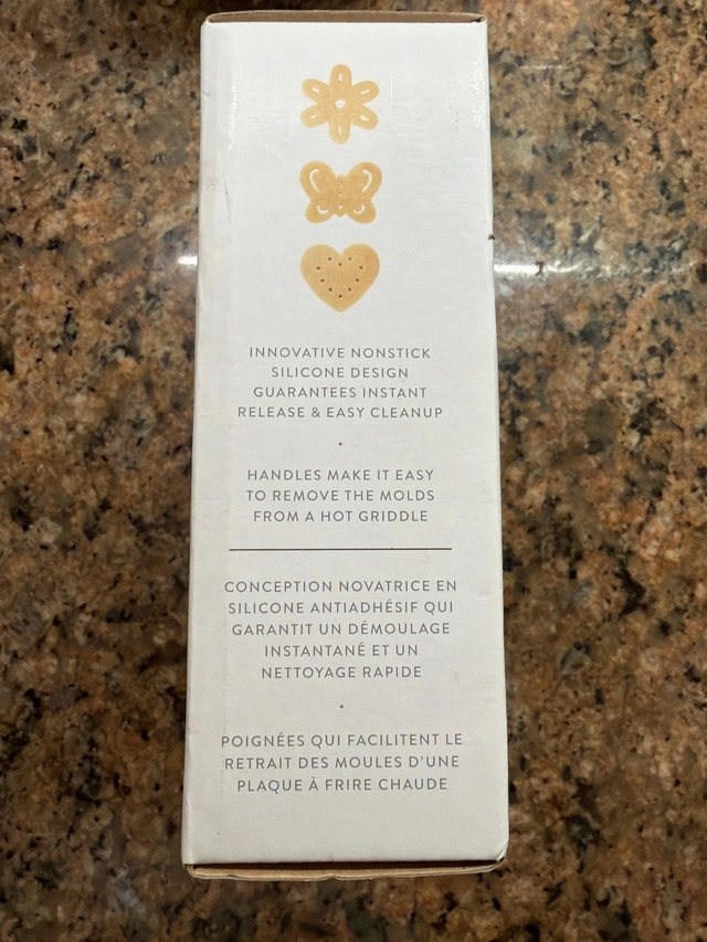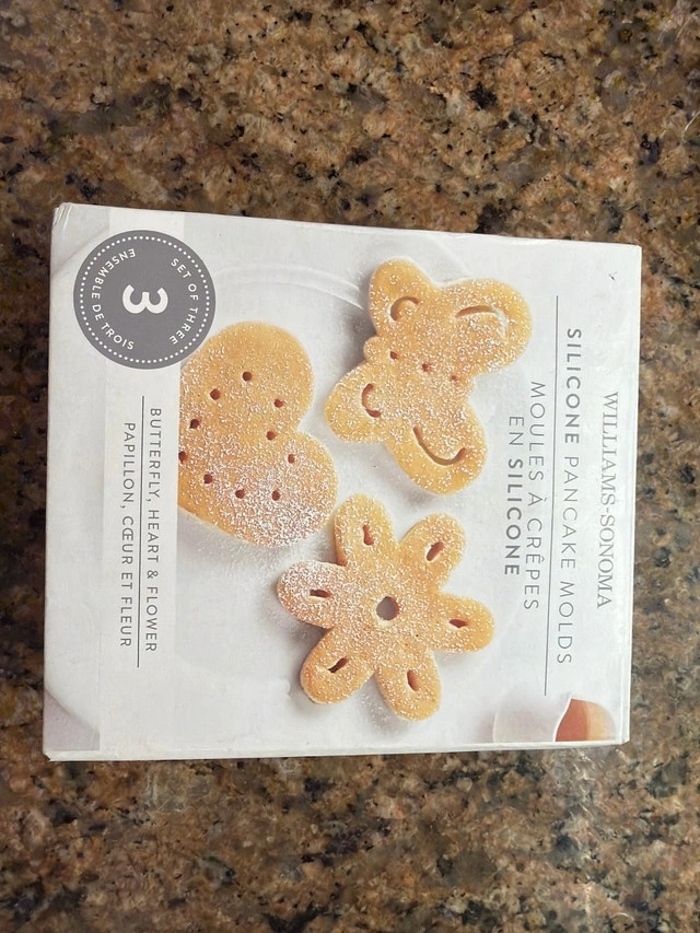 Selling a set of brand new Williams Sonoma pancake moulds, perfect for making fun shaped pancakes! This set includes three silicone moulds in the shapes of a butterfly, heart, and flower. They feature an innovative nonstick silicone design that guarantees instant release and easy cleanup. The handles make them easy to remove from a hot griddle. Asking $25 for the set. If the ad is up, they're available.
