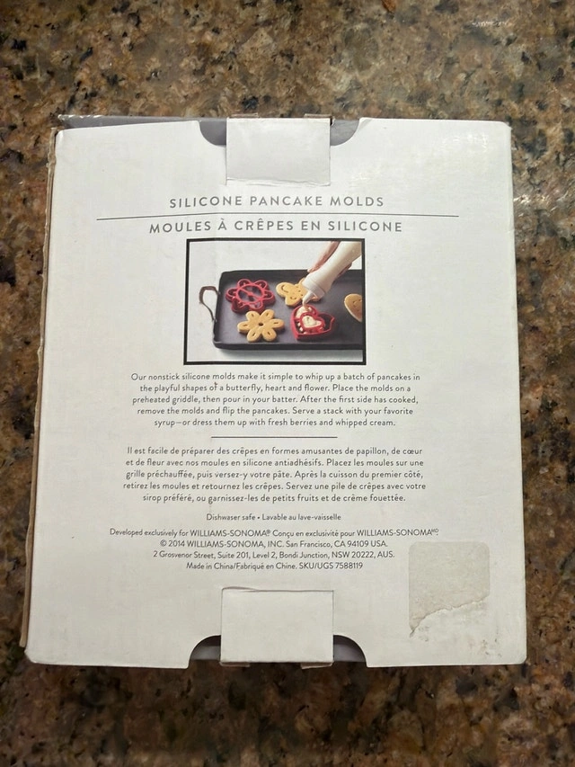Selling a set of brand new Williams Sonoma pancake moulds, perfect for making fun shaped pancakes! This set includes three silicone moulds in the shapes of a butterfly, heart, and flower. They feature an innovative nonstick silicone design that guarantees instant release and easy cleanup. The handles make them easy to remove from a hot griddle. Asking $25 for the set. If the ad is up, they're available.
