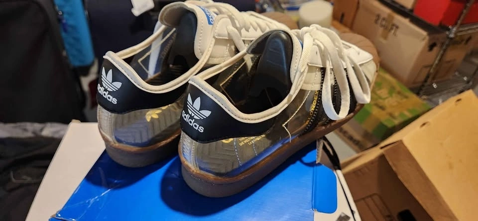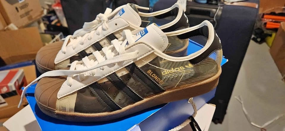 Pickup near Promenade Shopping Centre. Check my other online garage sale ads. The adidas Superstar 80 Blondey McCoy features a translucent PVC upper and sits atop a gum outsole with three-stripe styling. The see-through design allows for unique styling with your favorite socks. White laces, vamp, and ankle entry complement the translucent shell on a rubber gum outsole with herringbone patterns for traction.