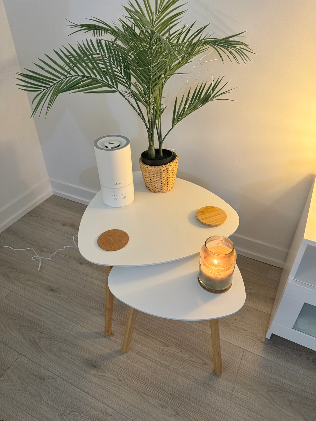 Set of two white nesting tables with wooden legs.
