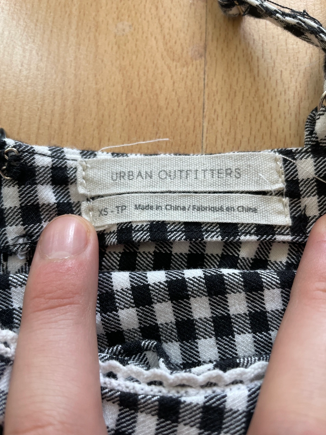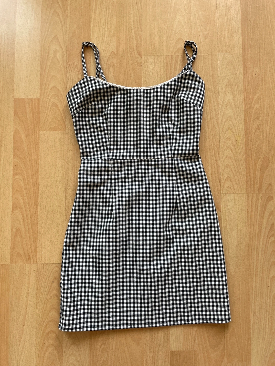 Black and white gingham mini dress with adjustable straps. Has a zipper closure in the back. The dress is in great condition. Size XS. Not available in store anymore, prices of online sellers are $20-40.