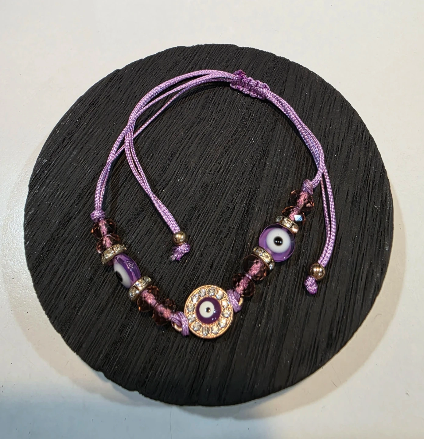 Purple cord bracelet with evil eye beads and rhinestones. Features adjustable tie closure. Includes multiple evil eye charms.