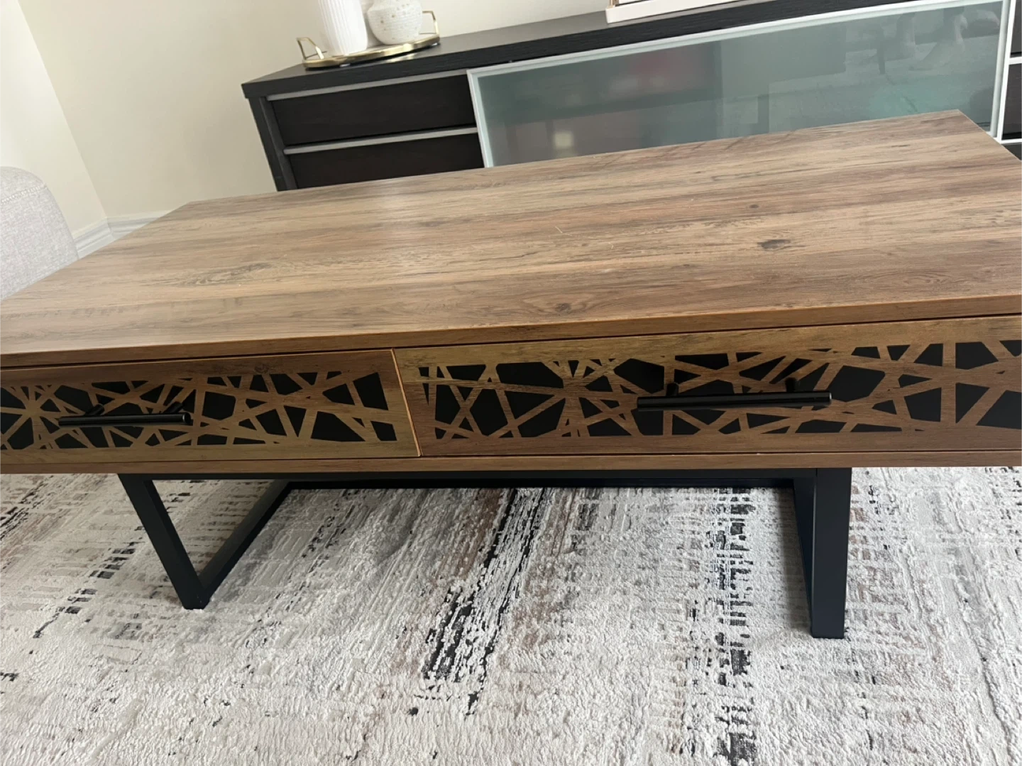 Structube Rectangular coffee table with decorative drawer fronts. It has two drawers with black handles for storage. Metal legs provide a sturdy base.
