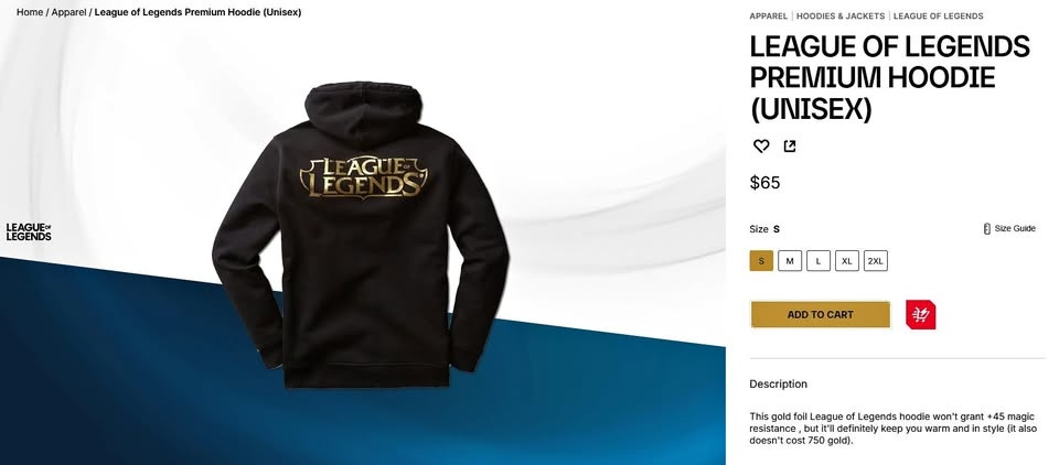 League of Legends Premium Hoodie (Unisex), Size Small. Asking $50 OBO. Additional pictures available on request. Can do pickup in any public place in Richmond or Canada Line stations.