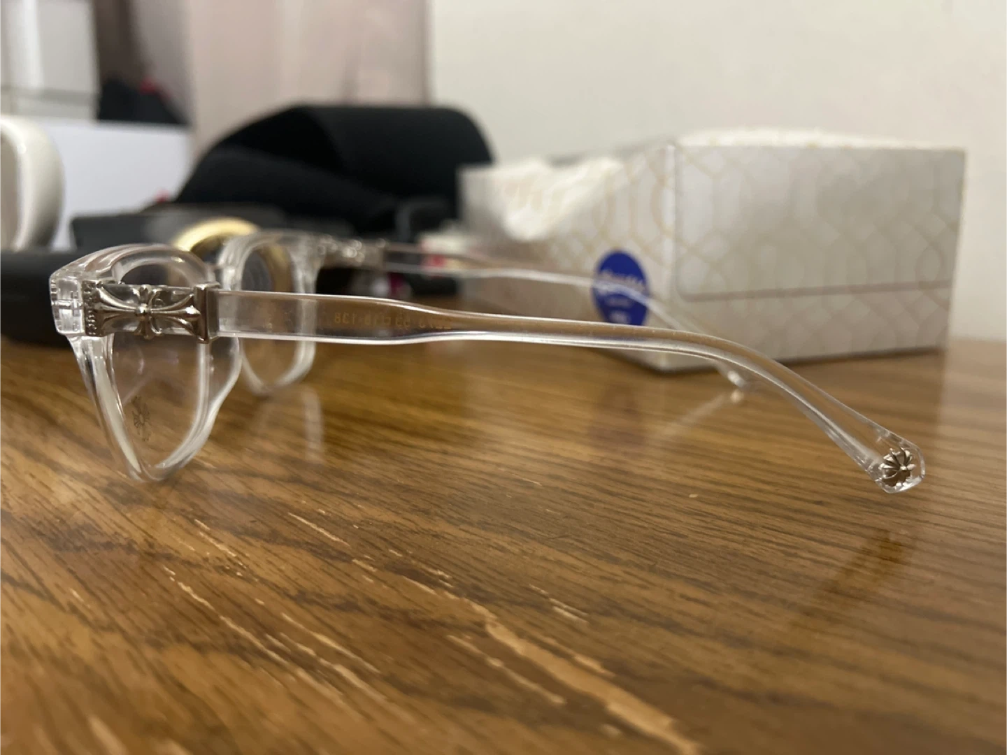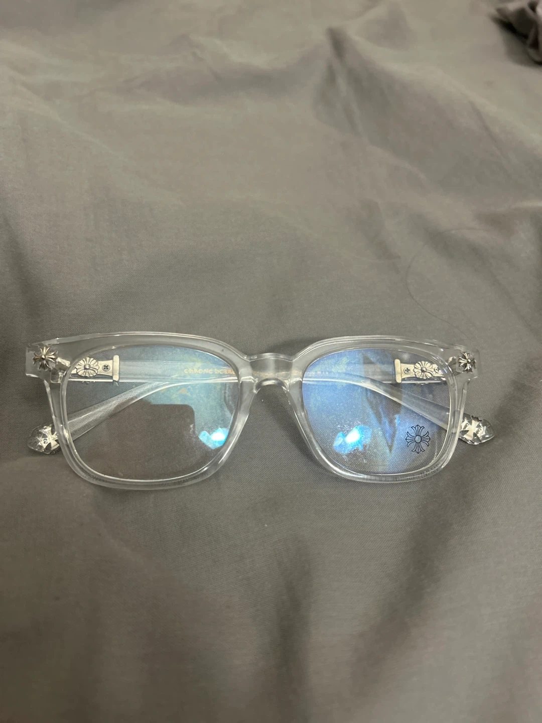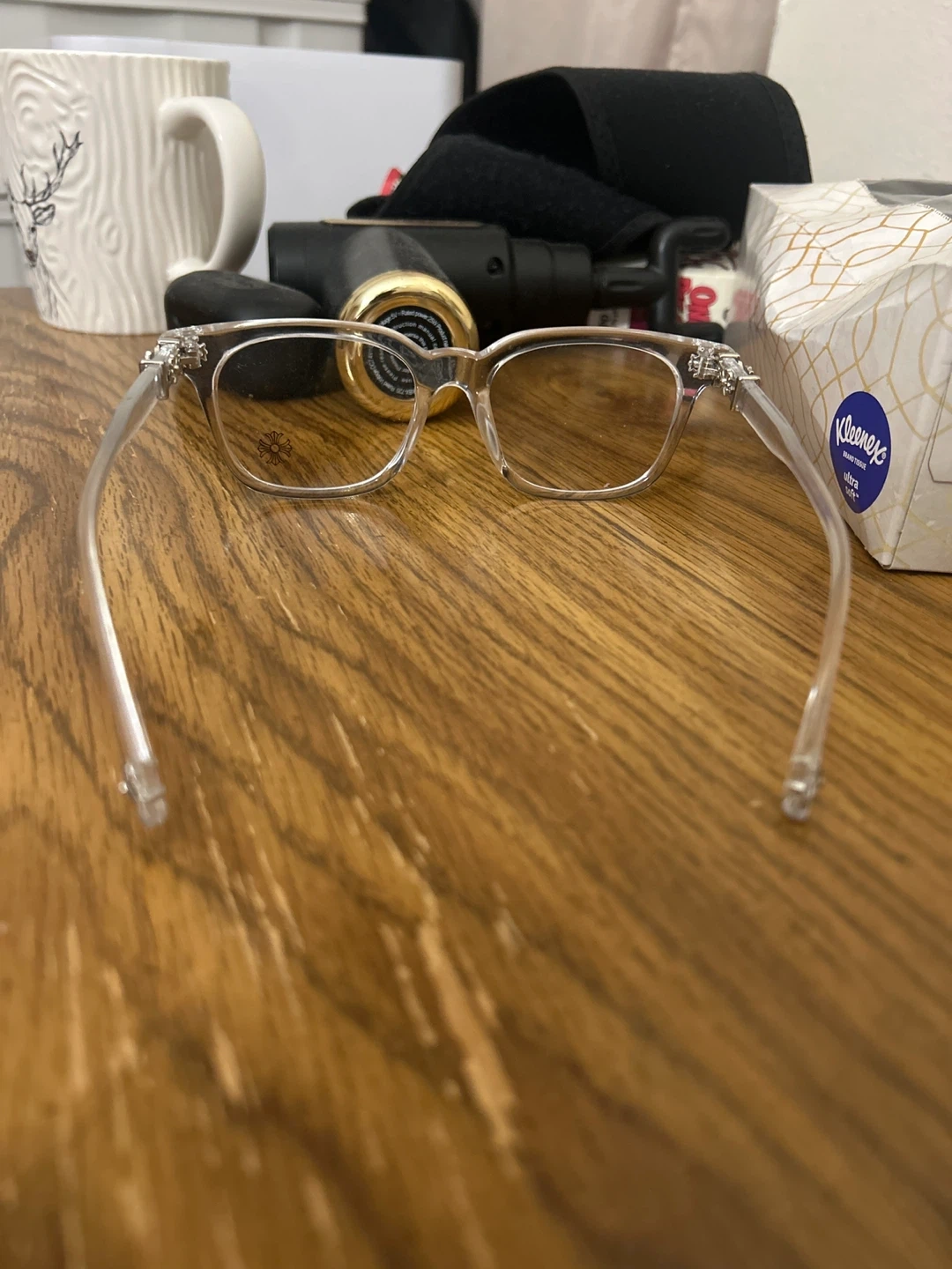 Selling a pair of Chrome Hearts glasses with clear frames. These glasses feature the iconic Chrome Hearts cross design on the sides. They're in great condition and ready for a new home!