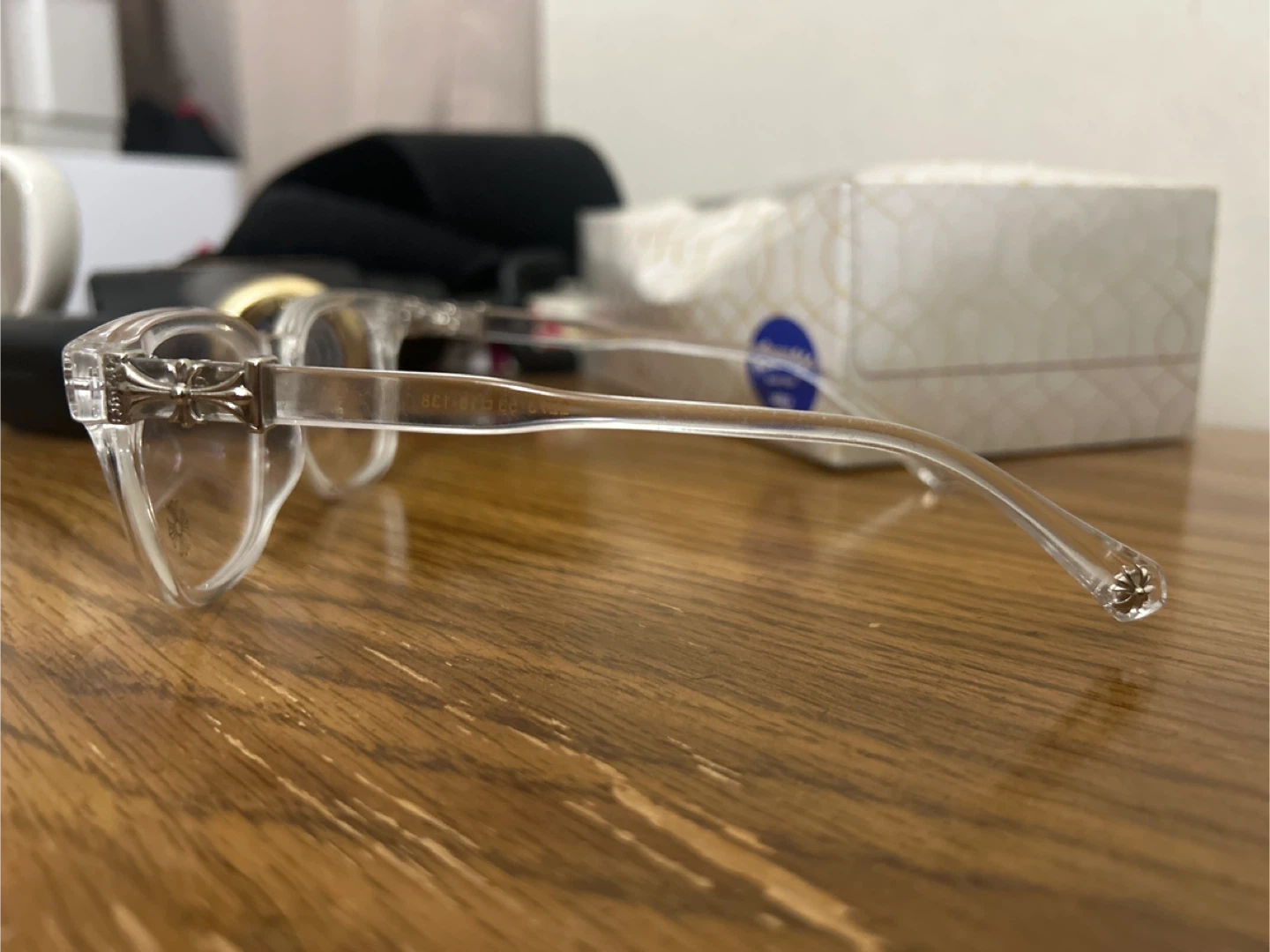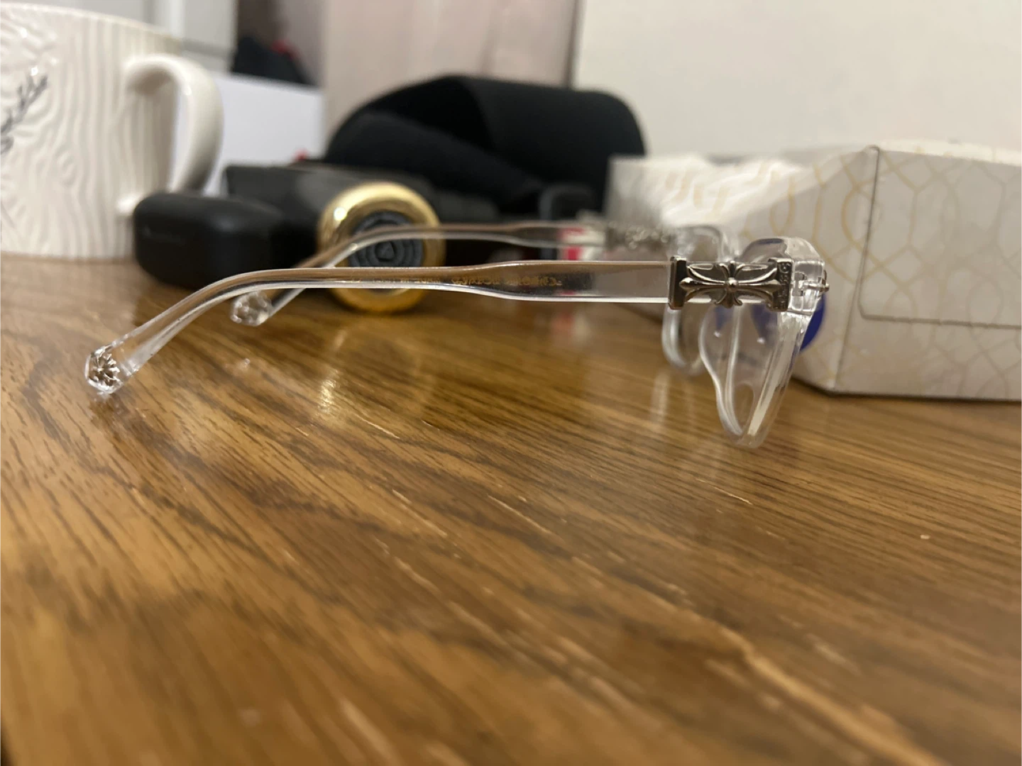 Selling a pair of Chrome Hearts glasses with clear frames. These glasses feature the iconic Chrome Hearts cross design on the sides. They're in great condition and ready for a new home!