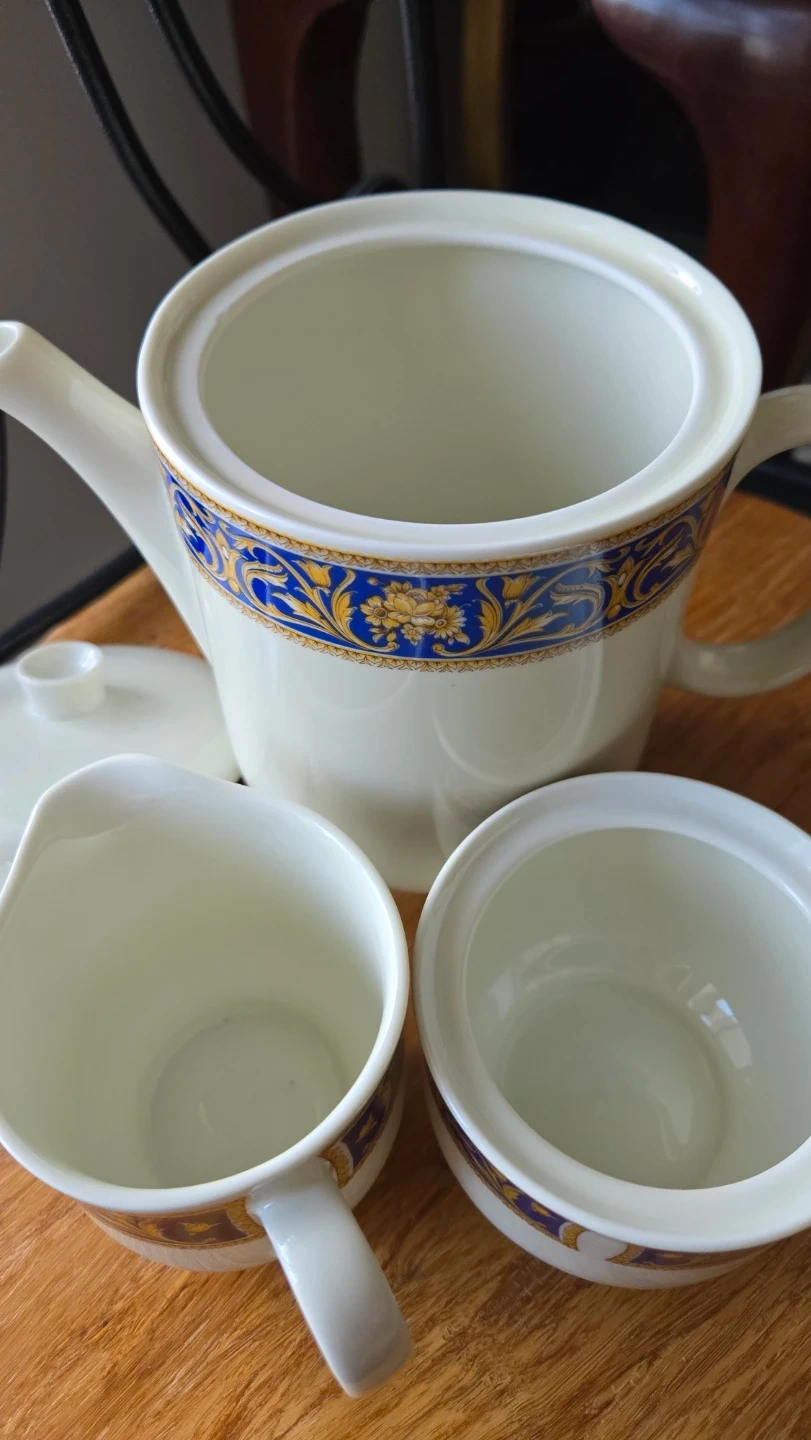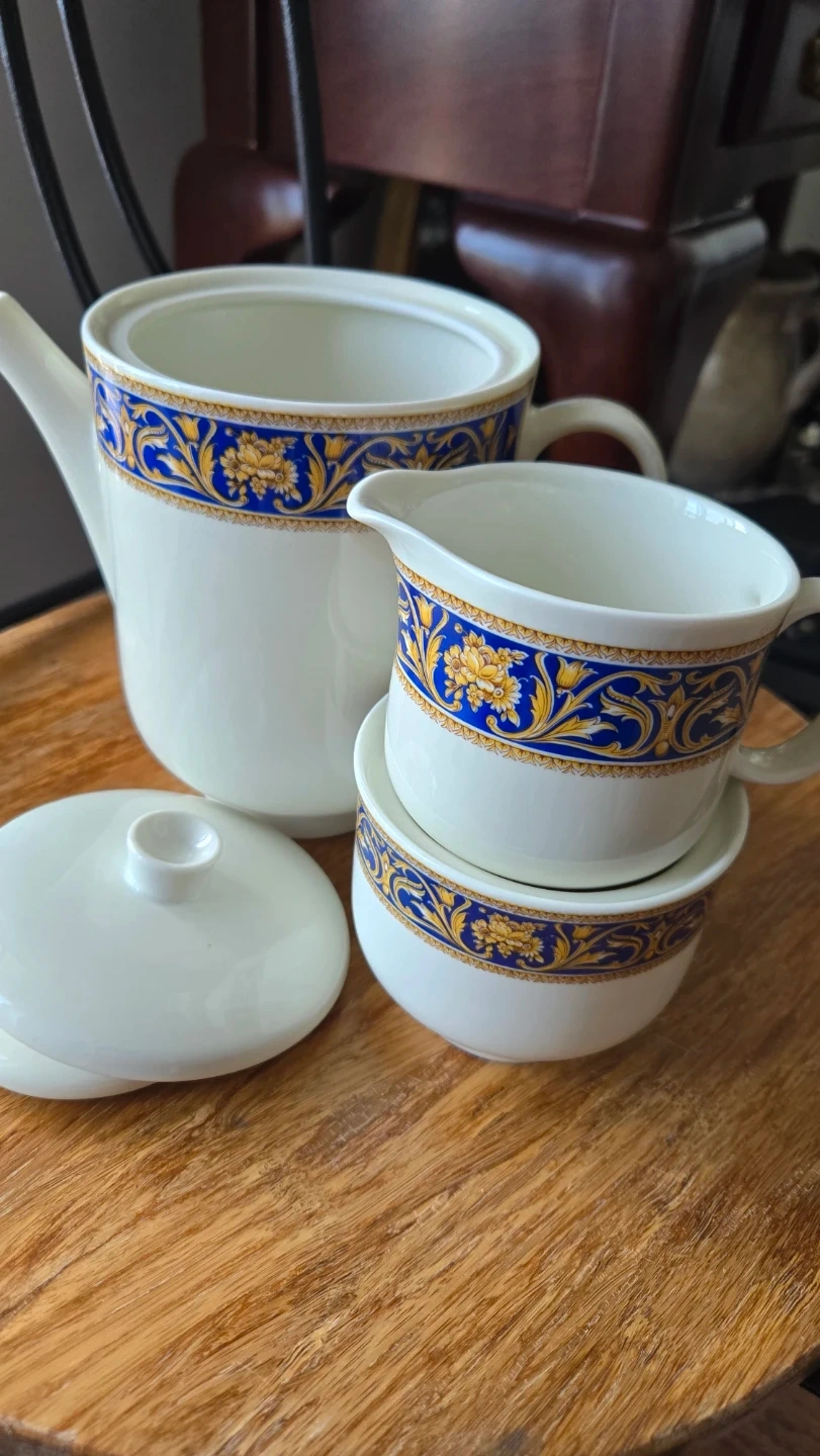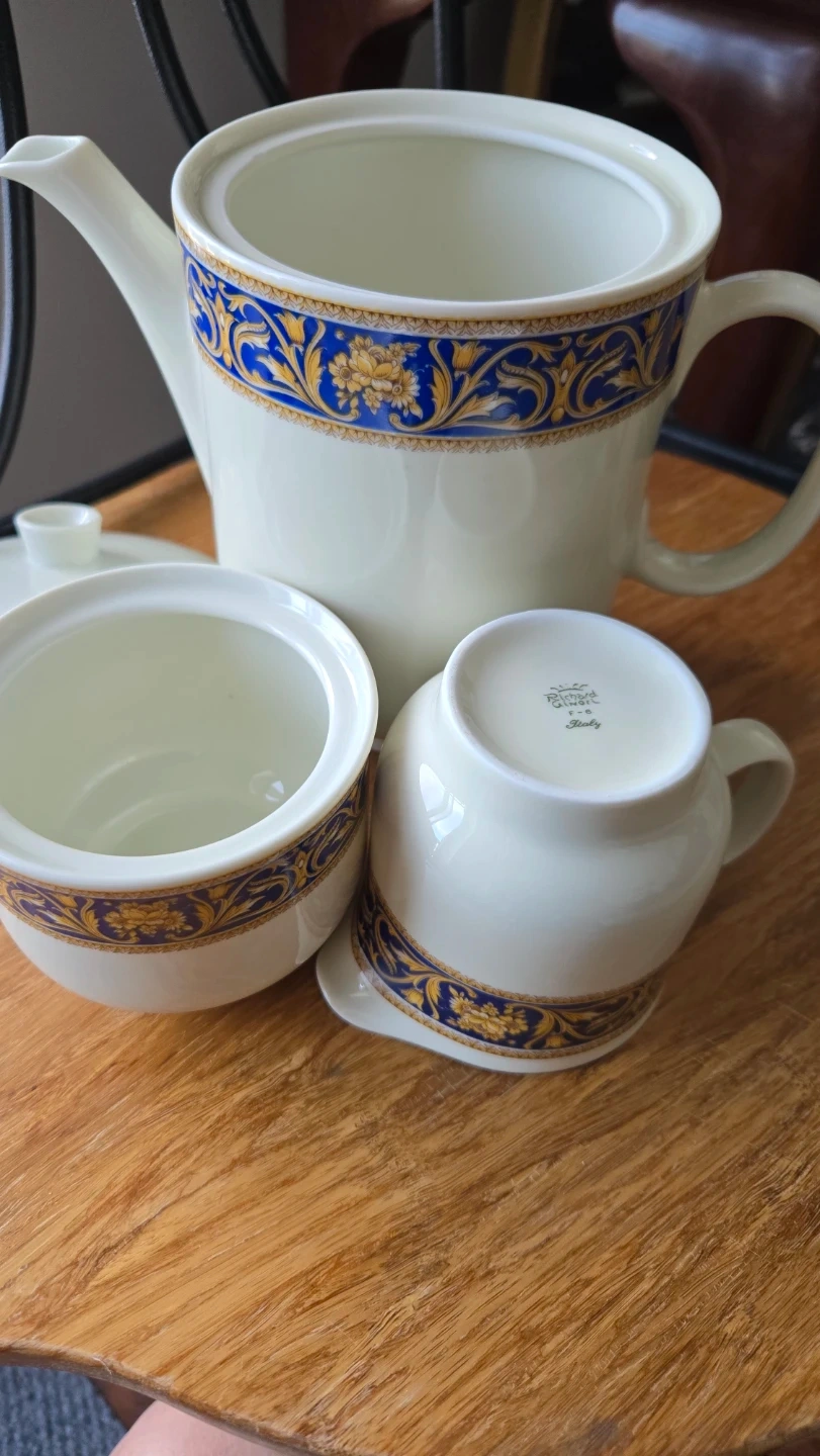 This is a three-piece Richard Ginori porcelain set, made in Italy. It features a white base with a blue and gold ornate pattern. The set includes a teapot, a sugar bowl with lid, and a creamer pitcher. Perfect for serving tea or coffee!