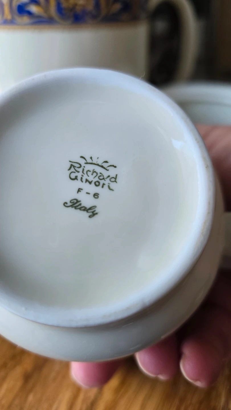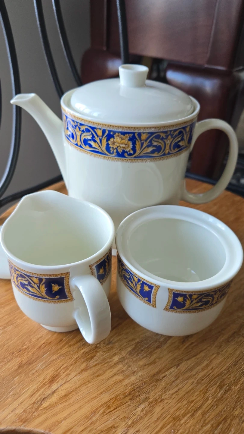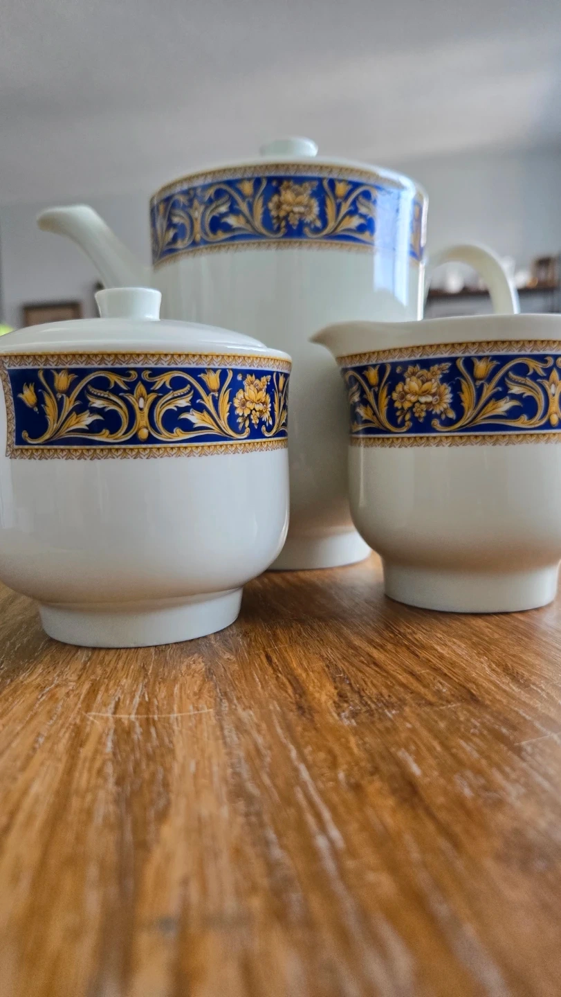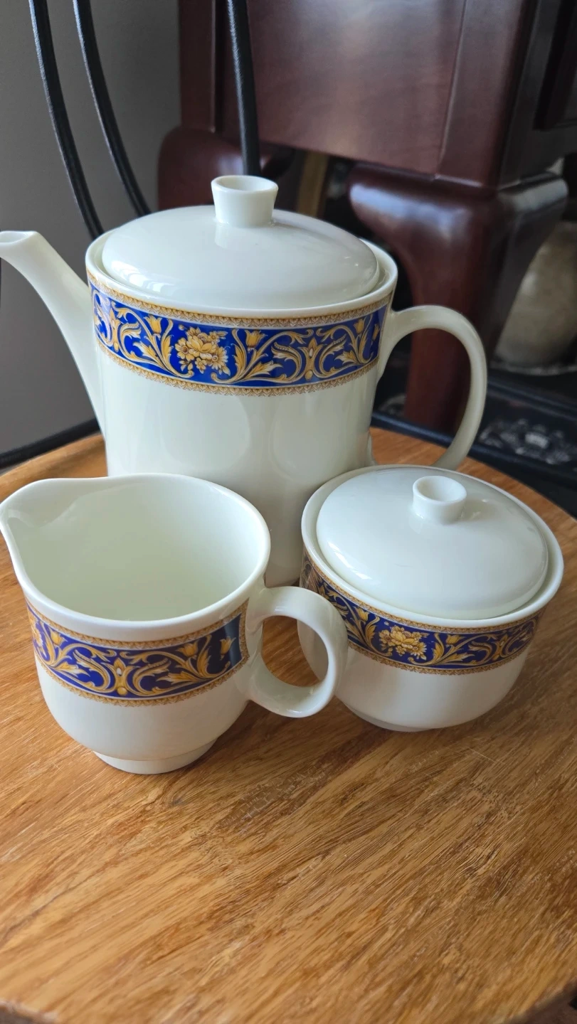 This is a three-piece Richard Ginori porcelain set, made in Italy. It features a white base with a blue and gold ornate pattern. The set includes a teapot, a sugar bowl with lid, and a creamer pitcher. Perfect for serving tea or coffee!