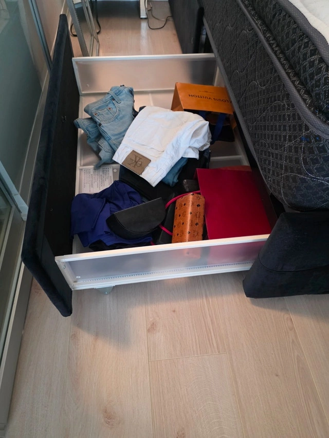 Black velvet upholstered platform bed with a tufted headboard. Features 4 storage drawers underneath. Includes a Serta mattress in like-new condition. Used - Good. For Sale By: Owner.