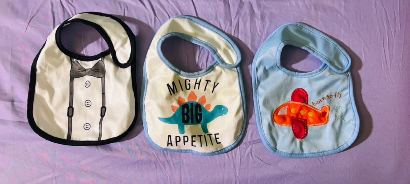 This set includes three baby bibs with fun designs. One bib features a tuxedo print, another has a dinosaur and 'Mighty Big Appetite' text, and the third shows an airplane with 'born to fly'. They're great for keeping your little one clean during meal times!