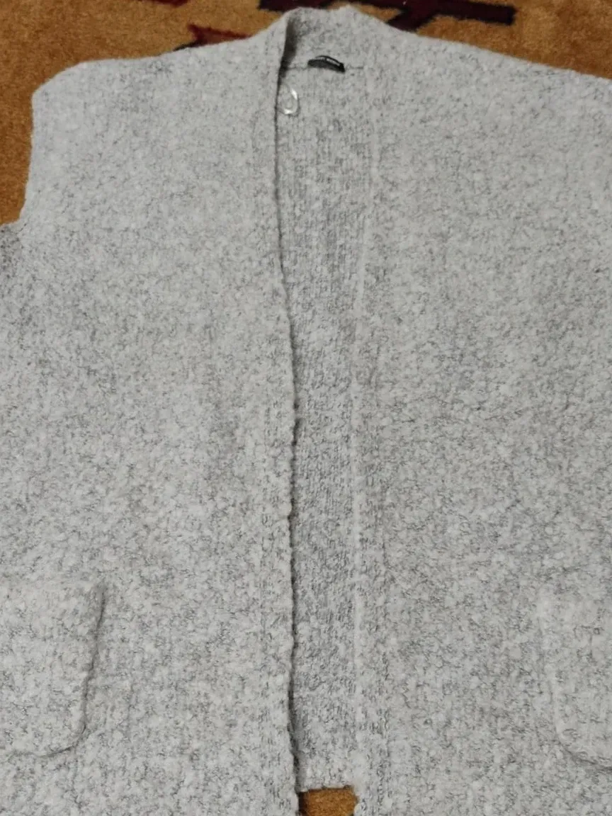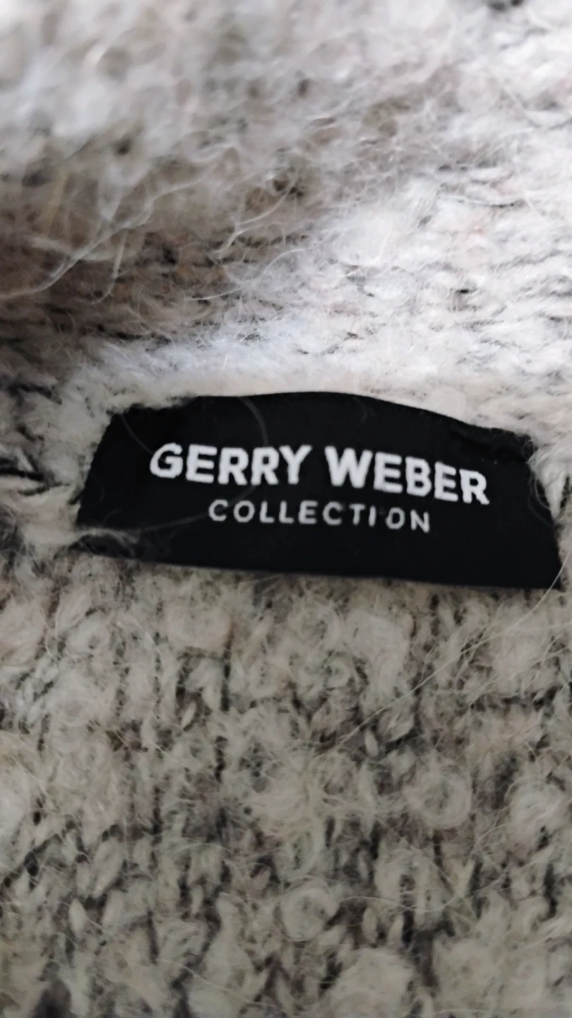 This is a Gerry Weber Collection cardigan in a speckled grey knit. It's a long-sleeved, open-front style with pockets. The material feels soft and cozy.