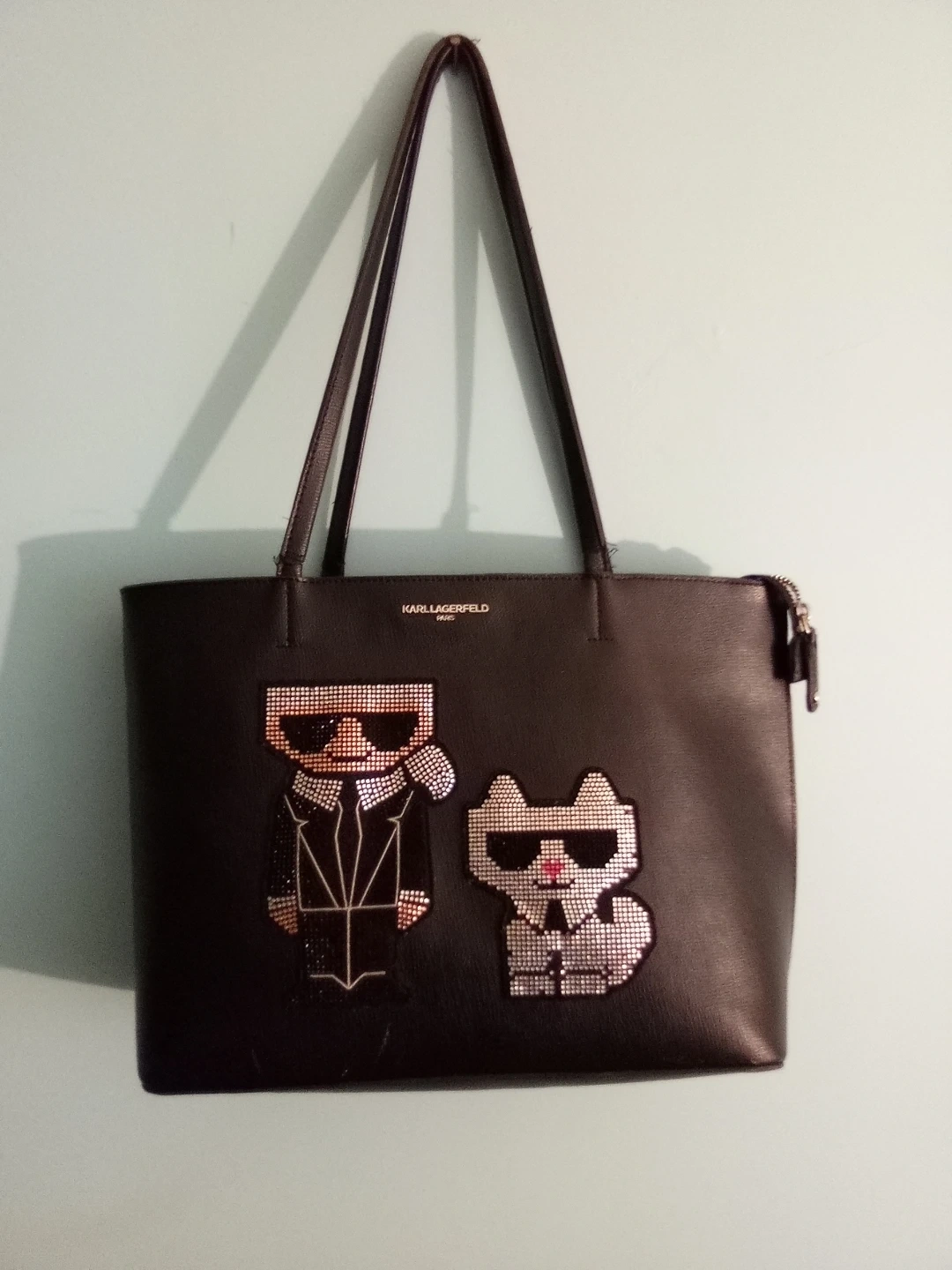 Selling a Karl Lagerfeld black tote bag. It features a fun design with Karl and his cat, Choupette, in sparkling embellishments. It's in great shape and ready for a new owner!