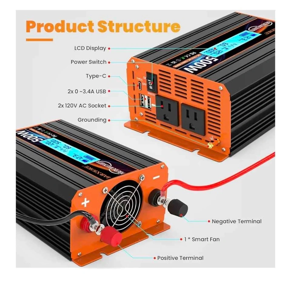 500 watt pure sine wave power inverter, DC 12V to AC 110/120V for home, RV, and off-grid solar systems with Type-C port, 2 AC outlets.