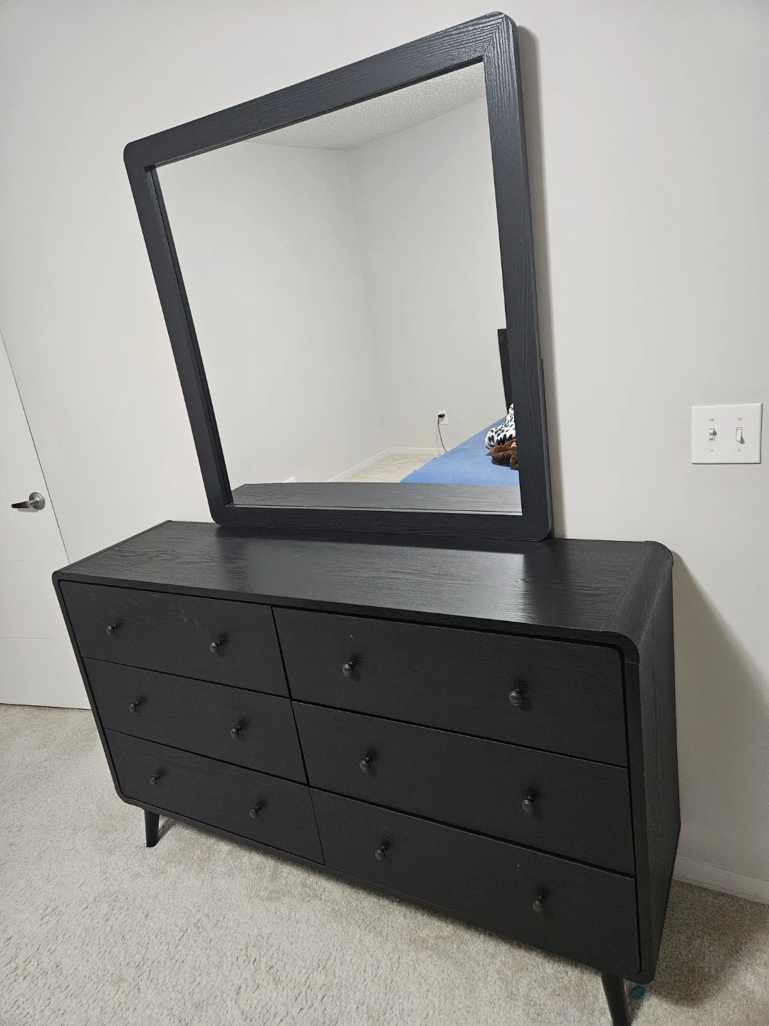 This black dresser comes with six drawers for plenty of storage. It has a modern design with tapered legs and includes a matching mirror. The finish is a dark wood grain.