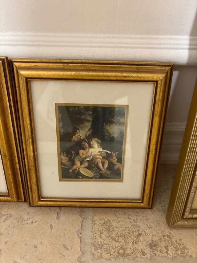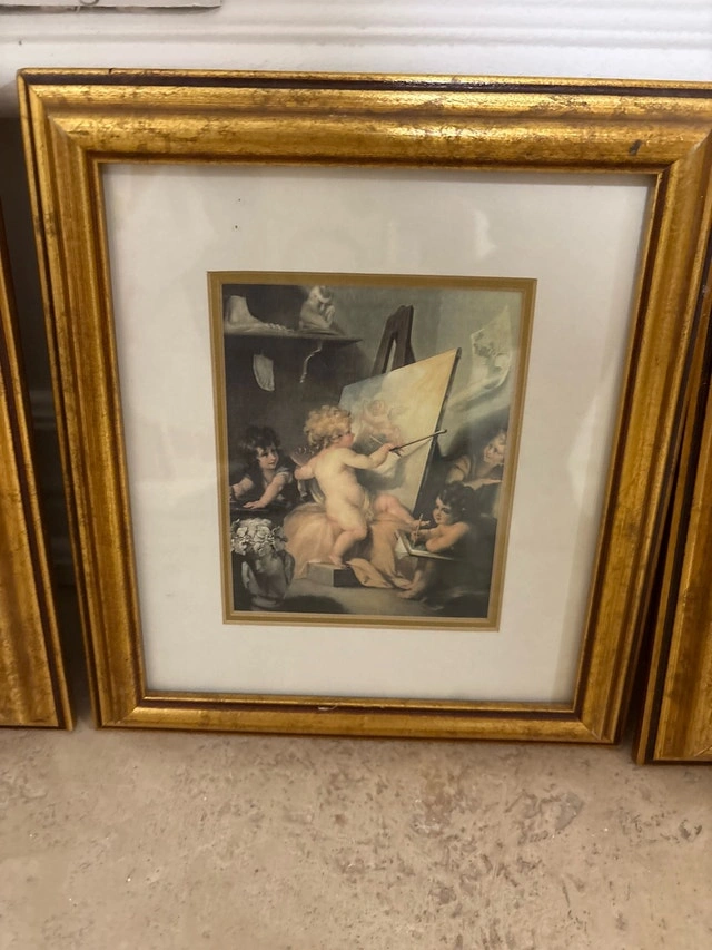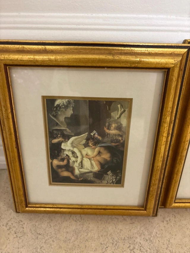Spruce up your space with this set of four framed prints, each showcasing classical cherubic scenes encased in elegant gold frames, with each frame having dimensions of approximately 8x10 inches. These picture frames are used and have some minor wear, but they are still a great way to display your favorite photos. Why not bring a touch of Renaissance charm to your home or office? Additional features include: - Classical cherubic scenes - Elegant gold frames - Dimensions: Approximately 8x10 inches. If the ad is still up, the frames are still available. Asking $60 for the set.