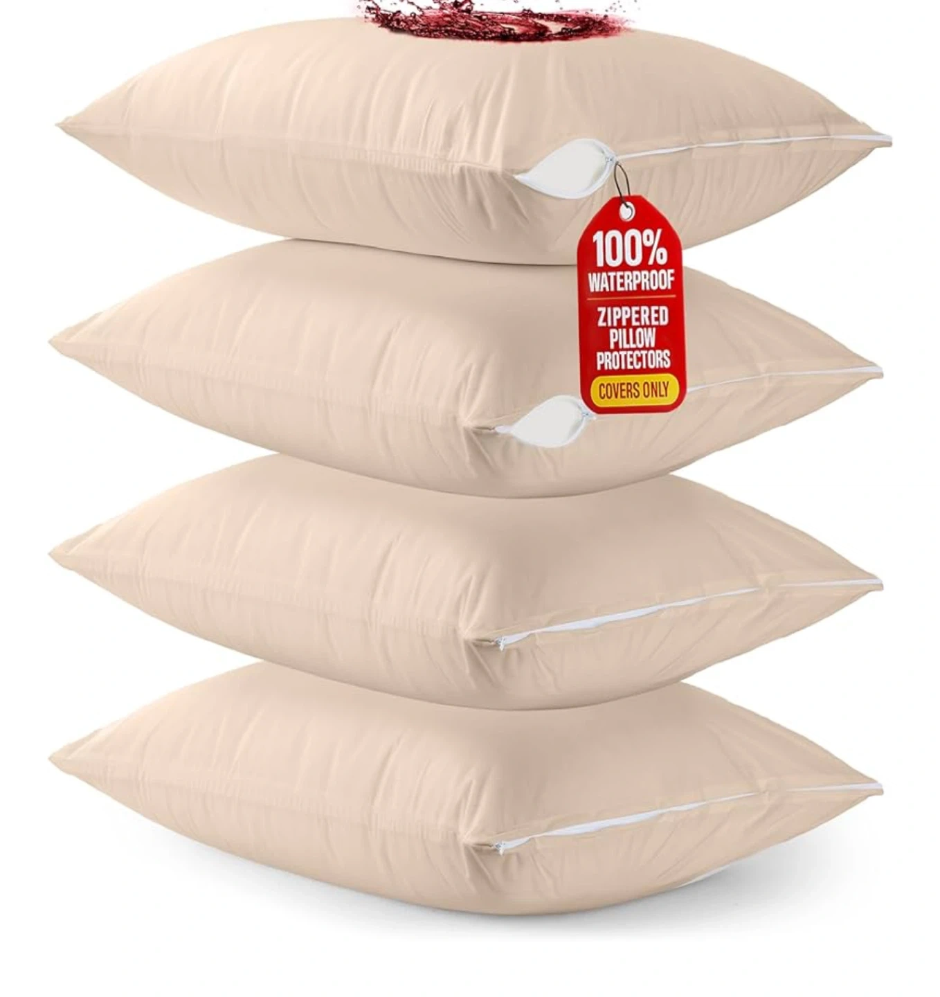 These beige pillow protectors are waterproof and have an easy zipper design! Size is 20 x 26 inches, perfect for standard pillows. Keep your pillows clean and dry with these zippered covers!