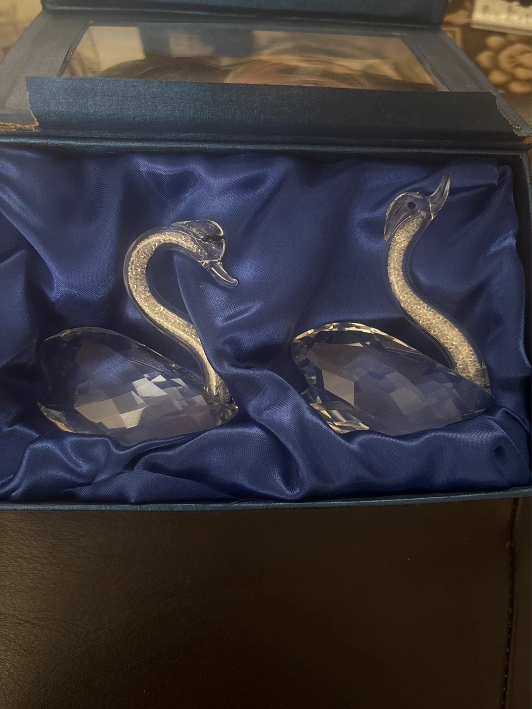 A set of two elegant crystal swan figurines. They have intricate detailing on their necks and wings. Each swan comes in its own velvet-lined compartment within a dark blue presentation box. These would make a lovely decorative accent for any shelf or table