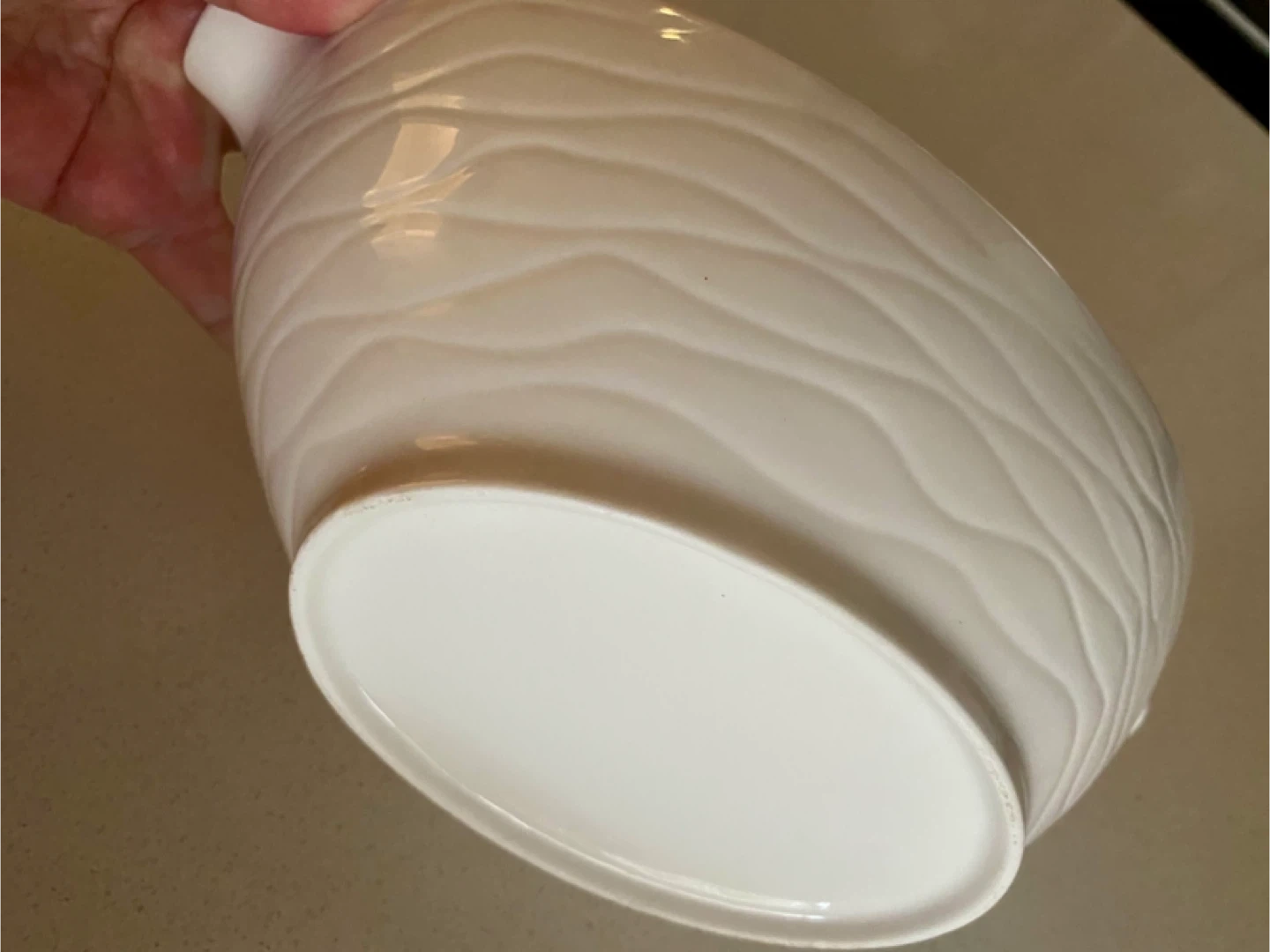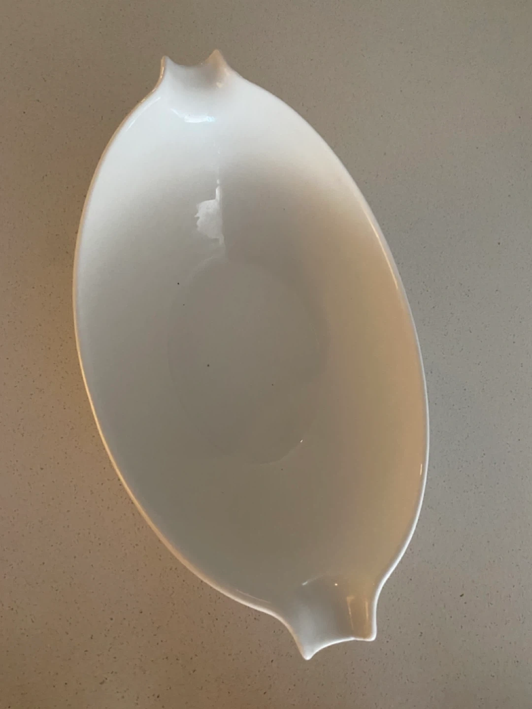 🥕Vintage , White ceramic serving bowl with a subtle wavy texture on the exterior. It has two side slots on each end. This bowl is great for serving salads or as a decorative centerpiece.