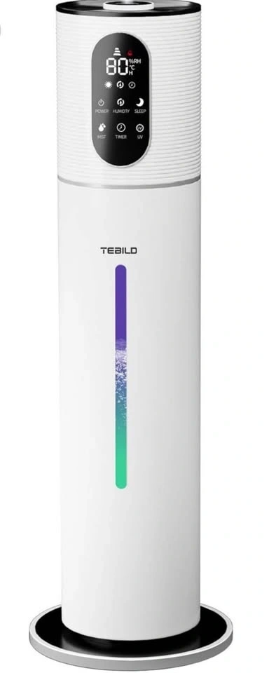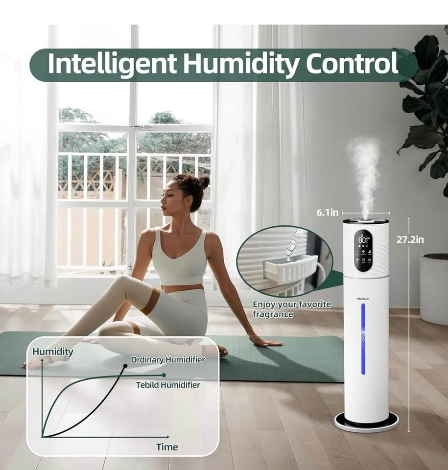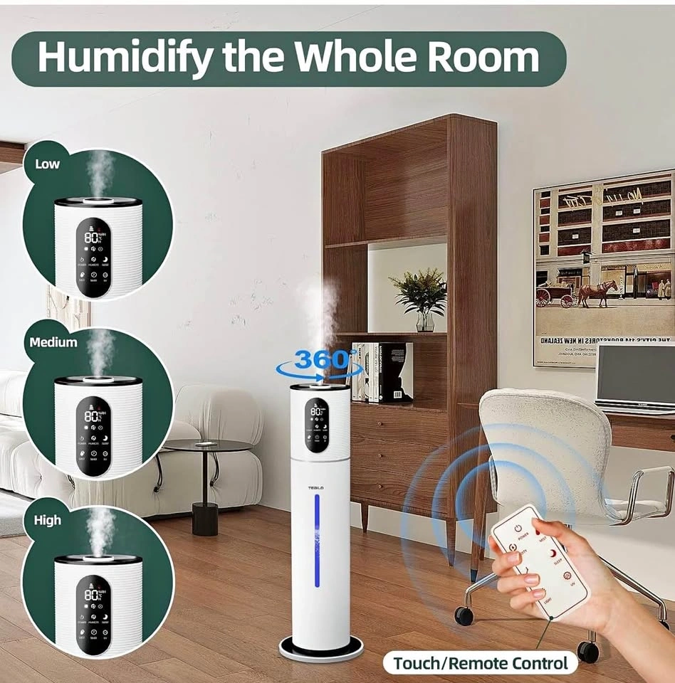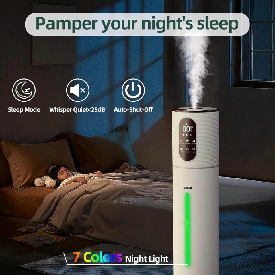 This humidifier is great for large bedrooms. It features a convenient top-fill design, a large 9L tank for long-lasting mist, and a 360° nozzle for even distribution. It also has a sleep mode and night light, making it perfect for bedrooms, especially for babies. It operates quietly and is also suitable for homes and offices.