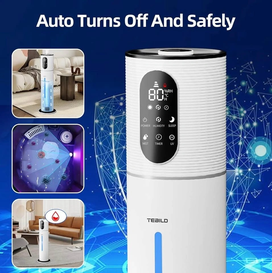 This humidifier is great for large bedrooms. It features a convenient top-fill design, a large 9L tank for long-lasting mist, and a 360° nozzle for even distribution. It also has a sleep mode and night light, making it perfect for bedrooms, especially for babies. It operates quietly and is also suitable for homes and offices.