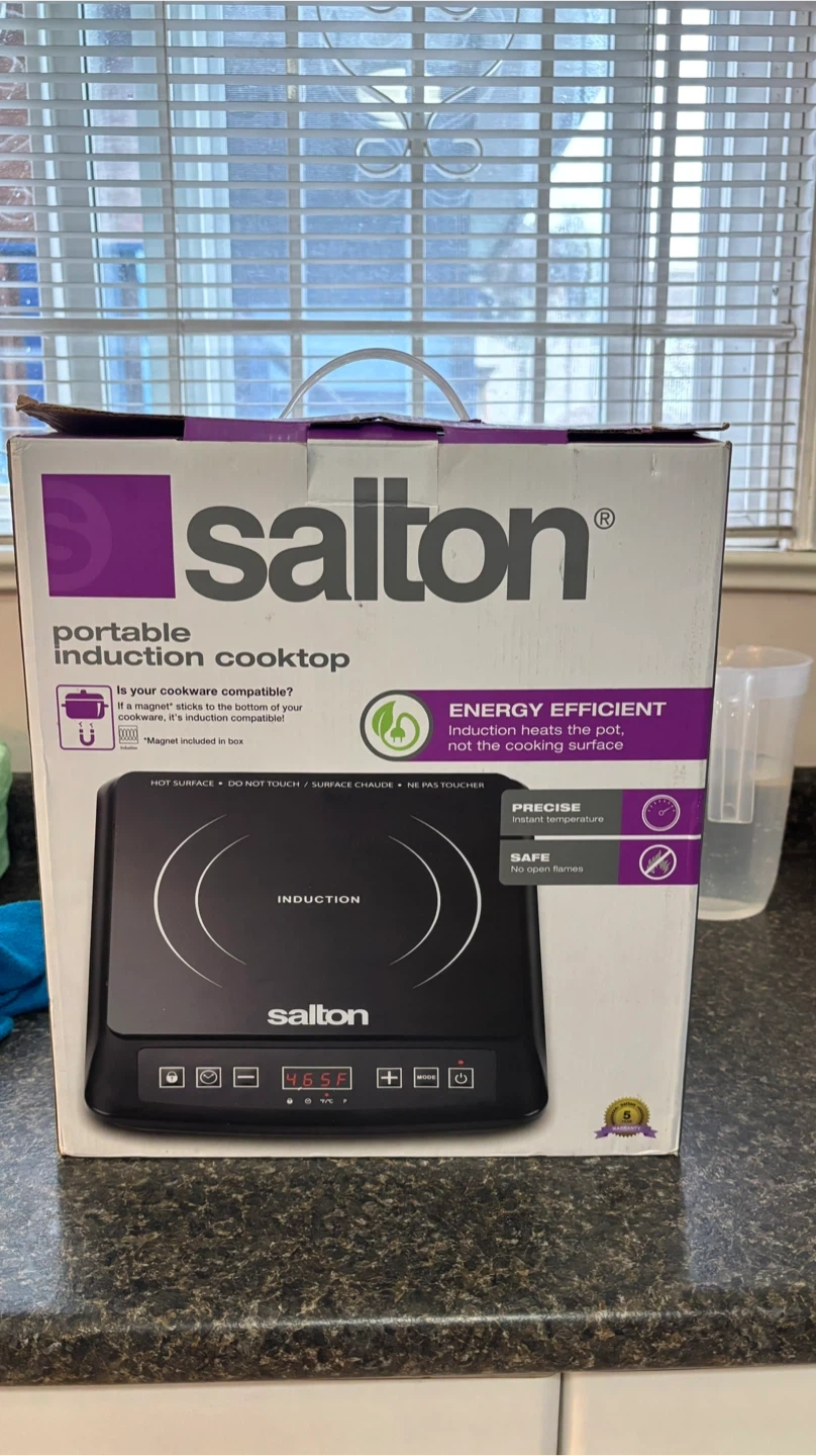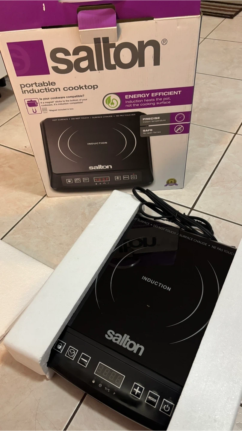 Selling a Salton portable induction cooktop in excellent condition! It's energy efficient, heating the pot and not the cooking surface. This cooktop is precise, offering instant temperature control, and safe, without open flames. Comes with the original box
