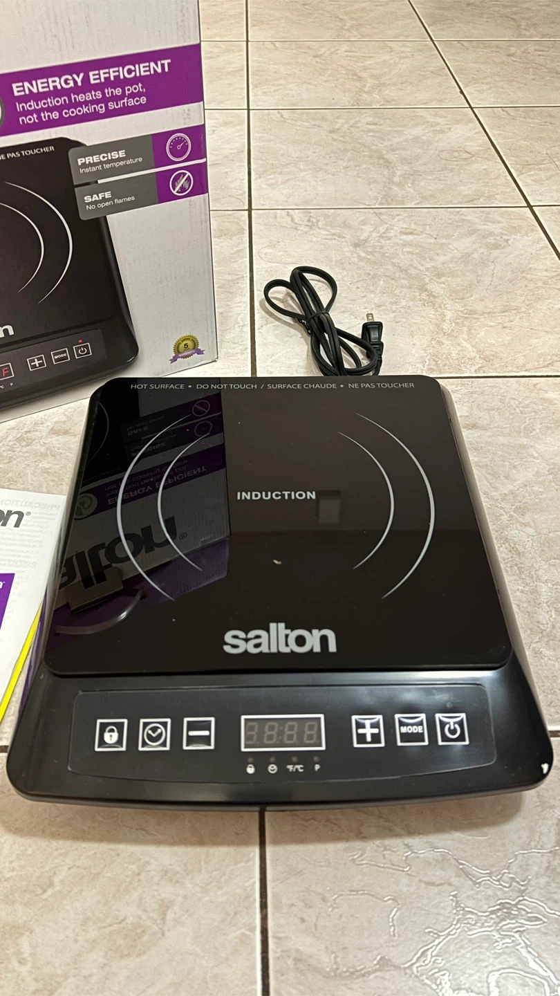 Selling a Salton portable induction cooktop in excellent condition! It's energy efficient, heating the pot and not the cooking surface. This cooktop is precise, offering instant temperature control, and safe, without open flames. Comes with the original box