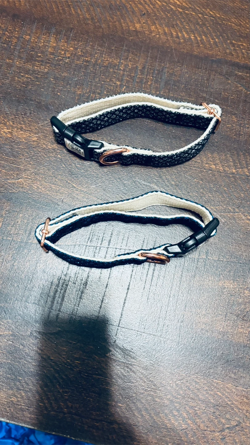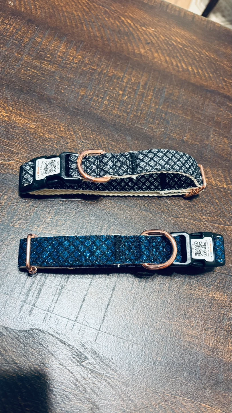 Sparkly dog collars in black and blue. Features copper hardware and an adjustable buckle. Includes QR code tags for pet identification. Great for stylish pups!