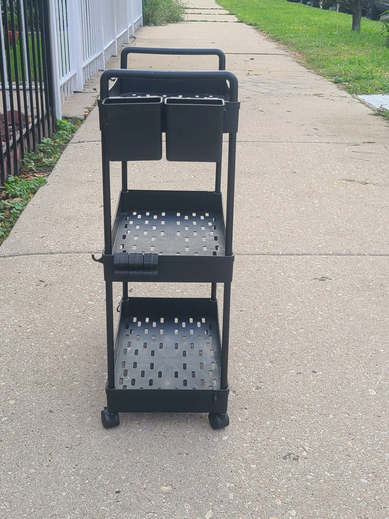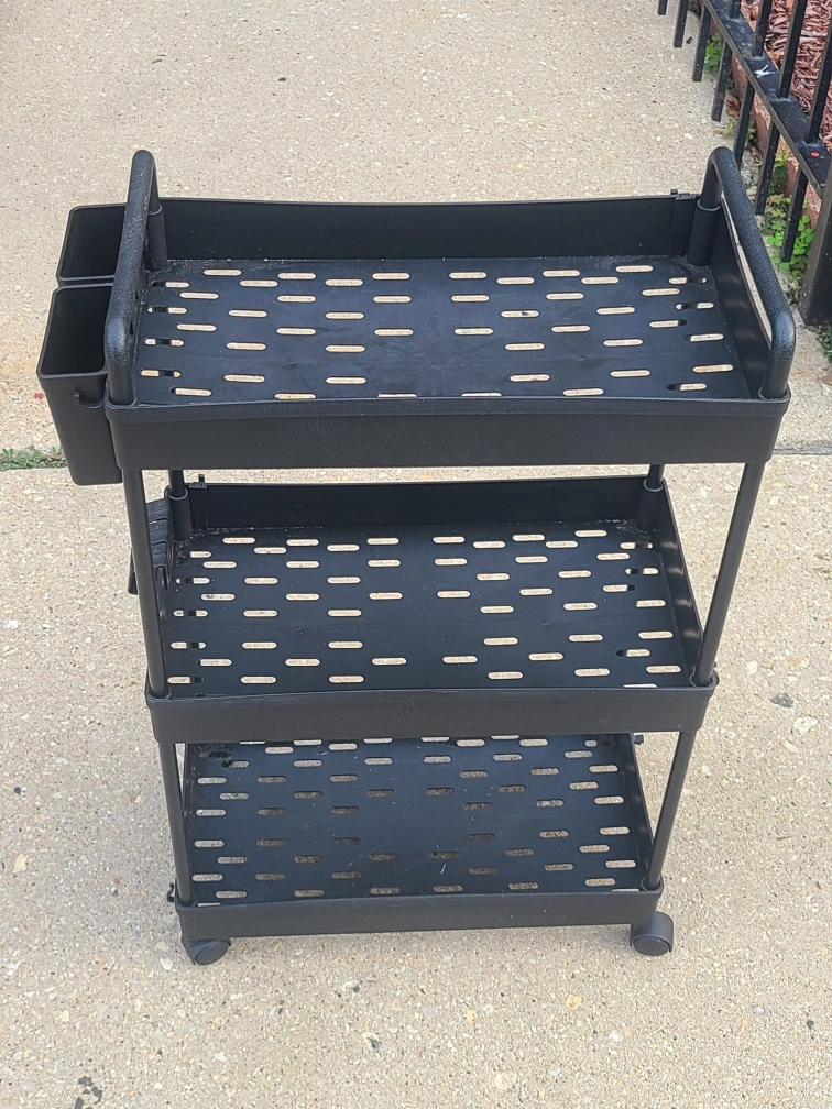 This is a black 3-tier rolling cart that's perfect for organizing your space! It has a sleek design and is easy to move around thanks to its smooth-rolling wheels. Great for use in the kitchen, bathroom, office, or anywhere you need extra storage