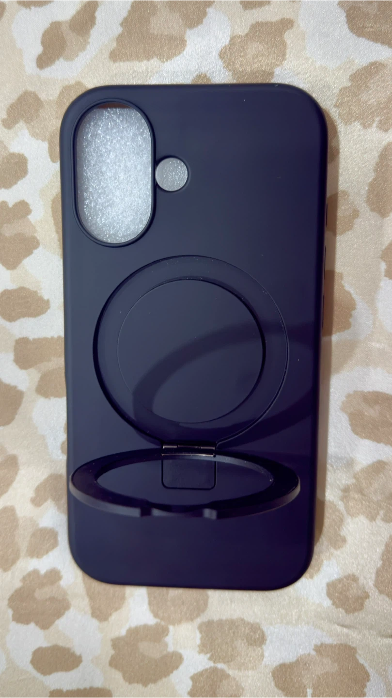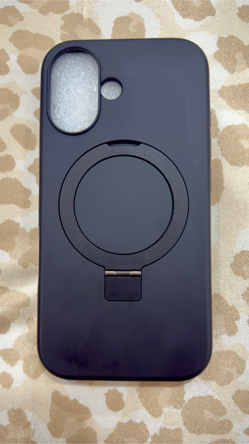 This black phone case features a built-in ring stand for easy viewing. It has a padded interior and a design that accommodates a Pro Camera system. It's made from a matte material that feels good in your hand.