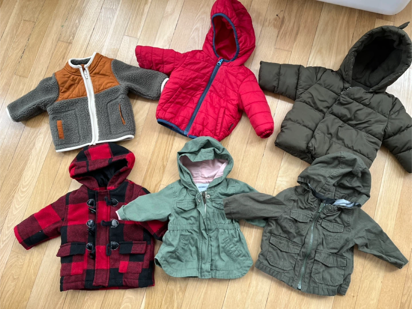 Each jacket is $10 except for the red plaid one $5 (the material besides buttons is coming off but no functionality lost). All others are barely worn, excellent condition.