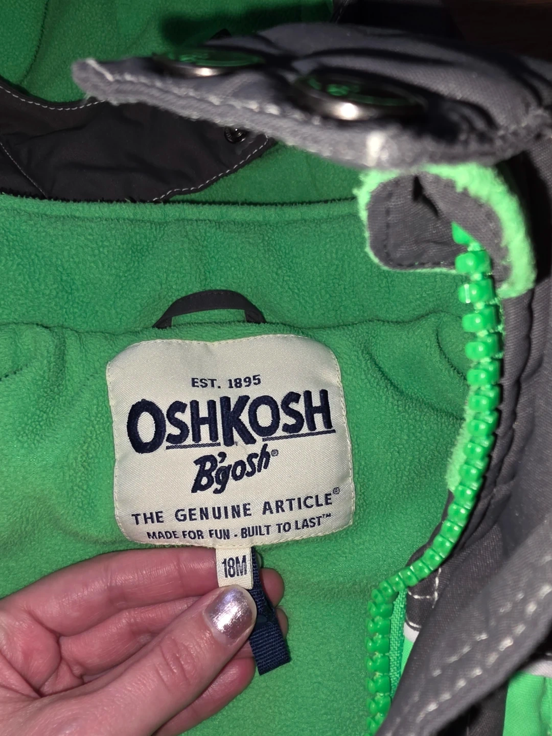Two-piece OshKosh B'gosh snowsuit in size 18 months. It's a grey and green ski jacket with a matching pair of insulated snow pants. Made for fun and built to last!