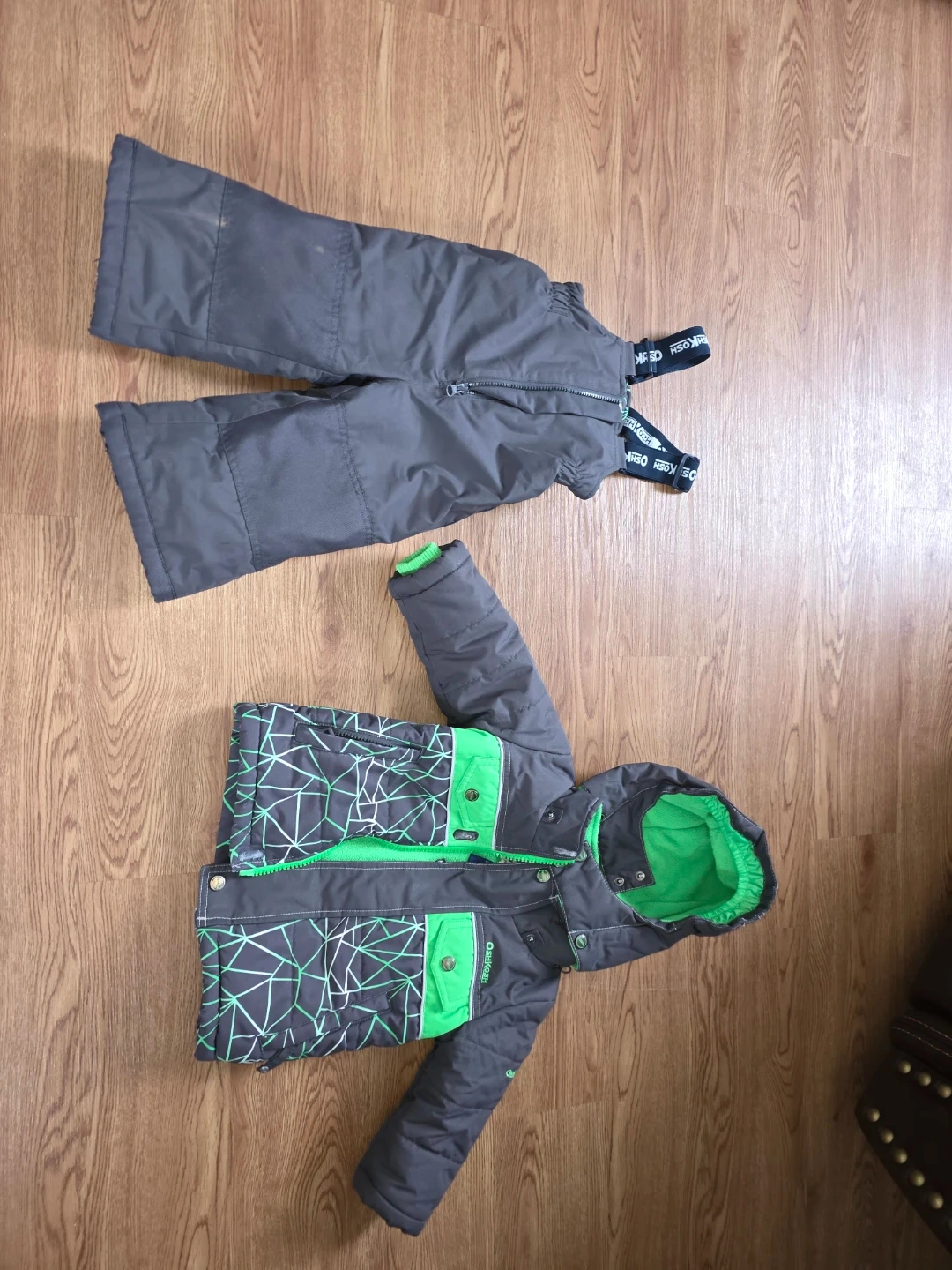 Two-piece OshKosh B'gosh snowsuit in size 18 months. It's a grey and green ski jacket with a matching pair of insulated snow pants. Made for fun and built to last!