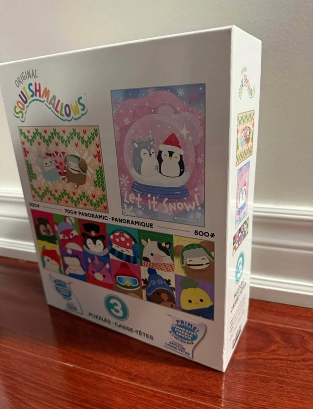 Get ready for puzzle fun with this new 3-in-1 Squishmallows jigsaw puzzle set, featuring adorable Squishmallows characters in festive winter scenes. Each puzzle varies in piece count, including 300, 500, and 700 pieces, perfect for different skill levels and hours of entertainment. * Three puzzles in one box * Includes 300, 500, and 700-piece puzzles * Features Squishmallows characters * Bonus puzzle poster included From pet and smoke free home Pick up at Creditview and Eglinton in Mississauga