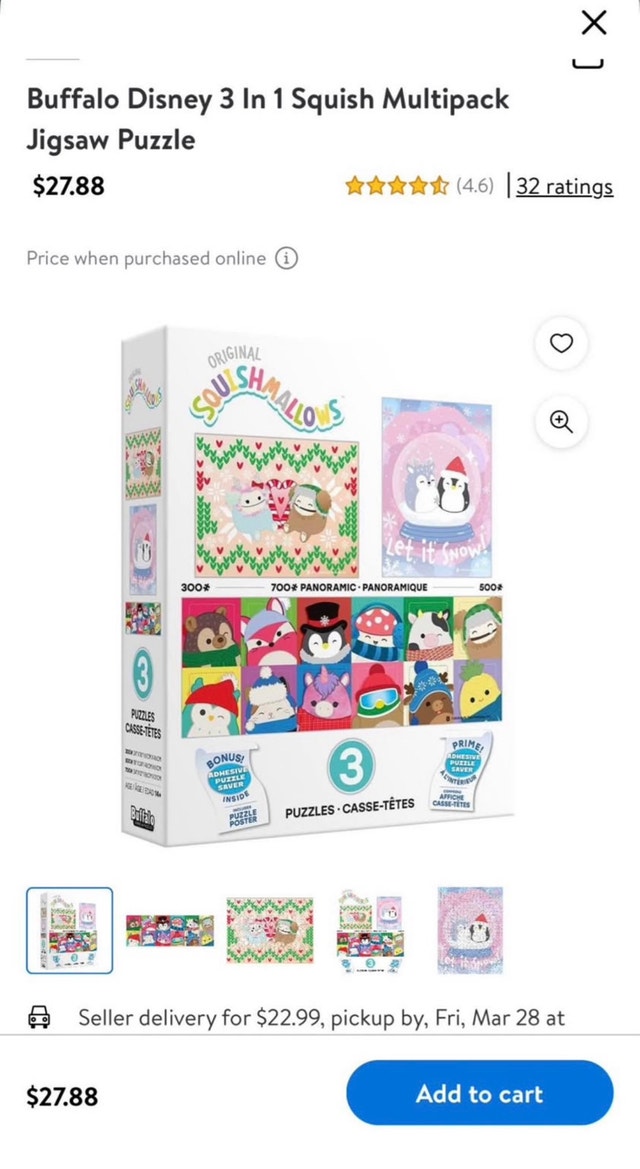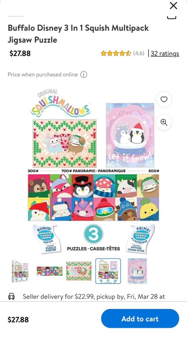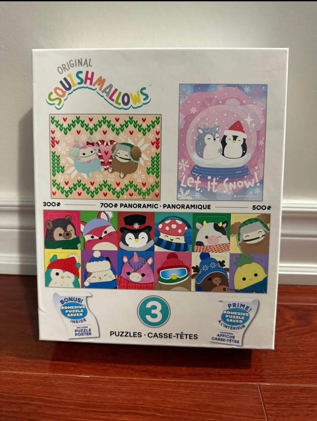 Get ready for puzzle fun with this new 3-in-1 Squishmallows jigsaw puzzle set, featuring adorable Squishmallows characters in festive winter scenes. Each puzzle varies in piece count, including 300, 500, and 700 pieces, perfect for different skill levels and hours of entertainment. * Three puzzles in one box * Includes 300, 500, and 700-piece puzzles * Features Squishmallows characters * Bonus puzzle poster included From pet and smoke free home Pick up at Creditview and Eglinton in Mississauga