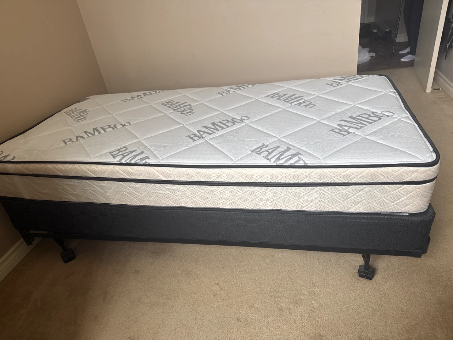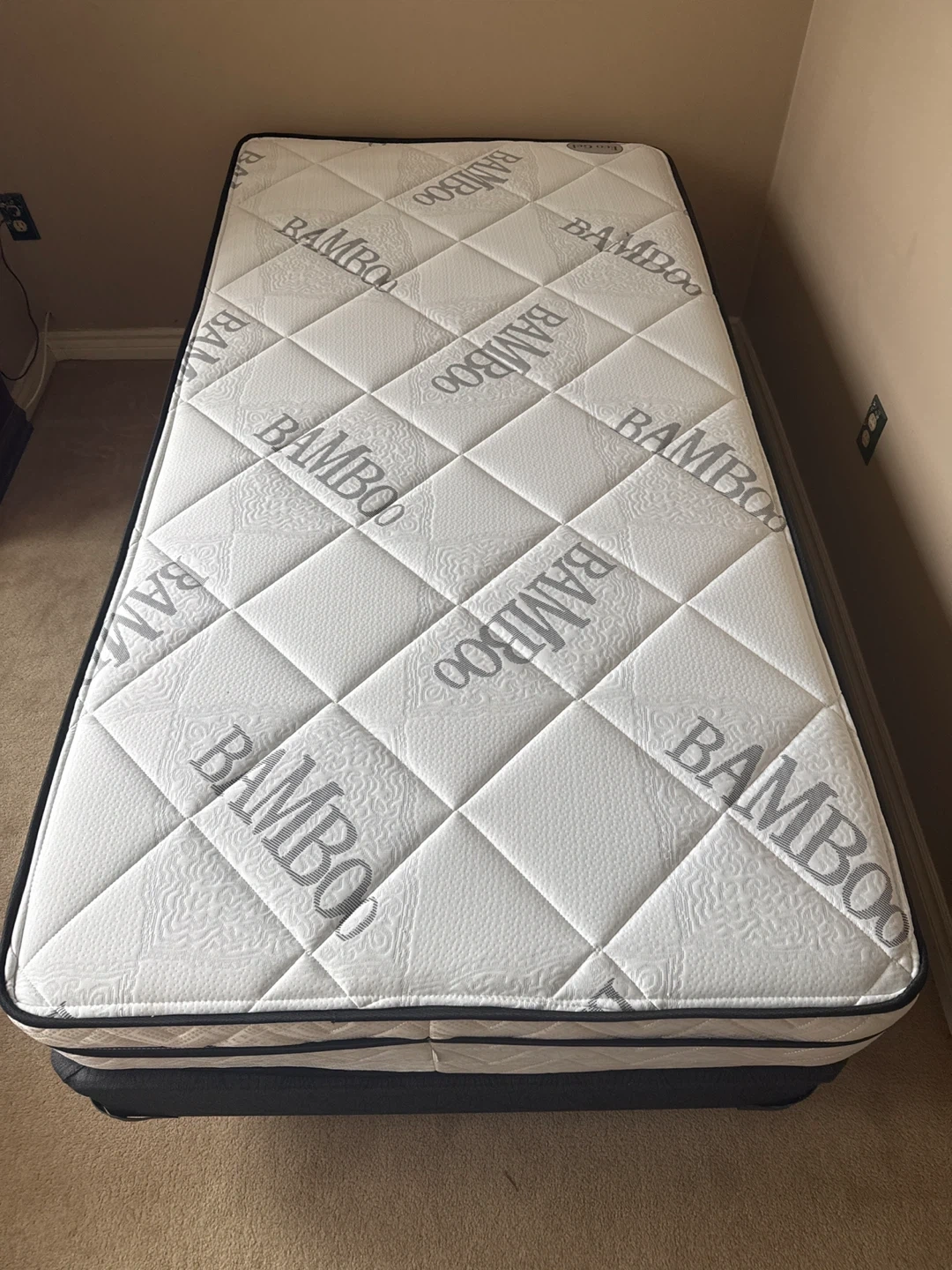 Twin size mattress with a bamboo top. Comes with a black box spring. Great for a guest room or child's bedroom! Also comes with the metal frame with wheels. Never been slept used or slept in.