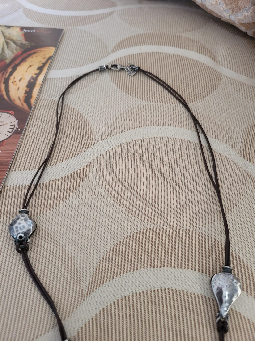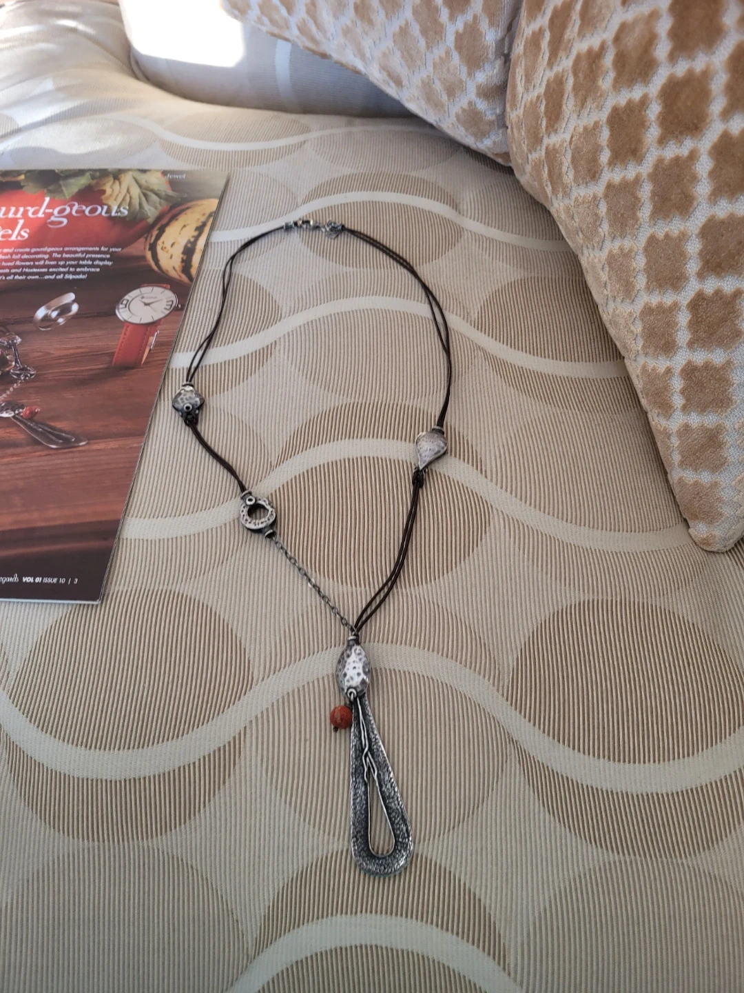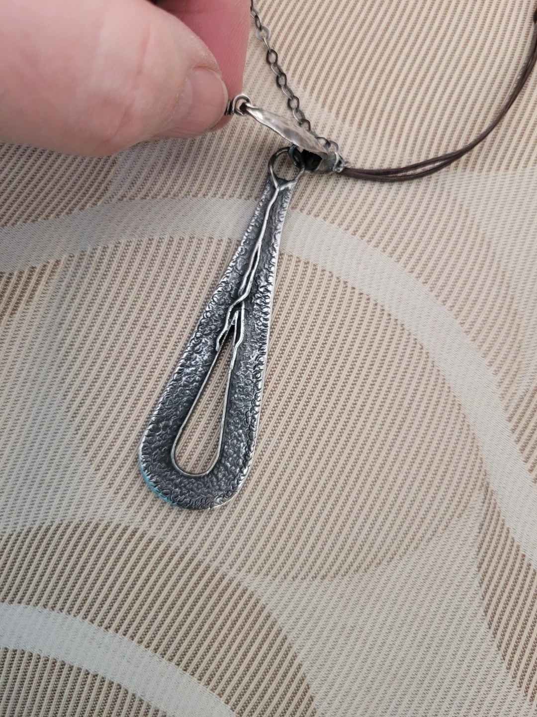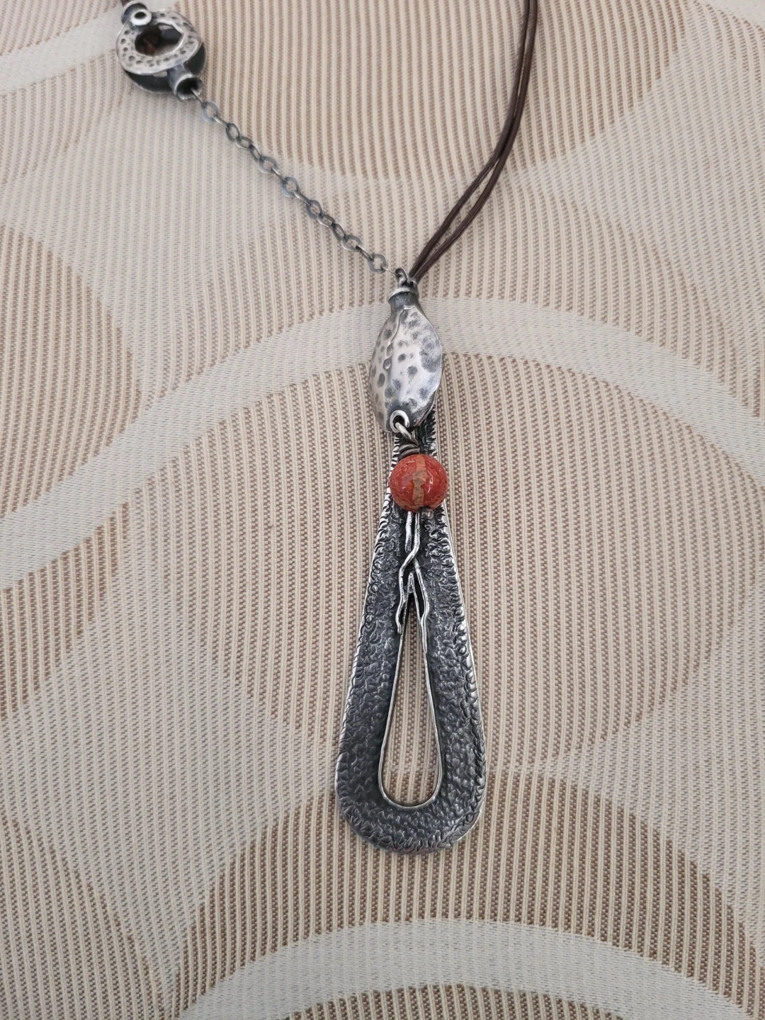 Retired Silpada Oxidized Hammered Silver necklace featuring a textured silver drop pendant on a brown leather cord. It has an orange bead accent. 22' length