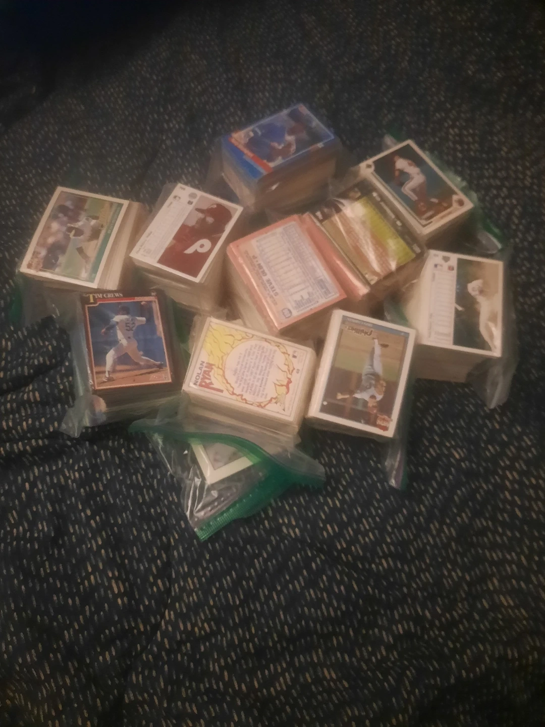 1$ per card This is a collection of various baseball cards. They are housed in plastic sleeves and small bags. Some cards are visible including players like Tim Crews and Nolan Ryan.